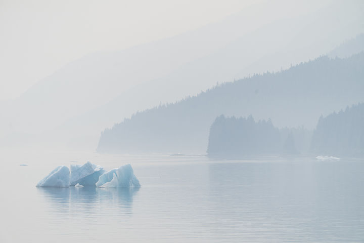We started our day surrounded by fog and a garden of ice. We visited the ice fields at the mouth of Le Conte Glacier’s fjord. Le Conte Glacier is the southernmost tidewater glacier (glacier that meets the ocean) in North America. Cruising by Zodiac allowed us to approach massive icebergs that have calved from the glacier front and floated down the fjord until they became grounded on the underlying seafloor. The lack of wind created a beautiful glassy surface on the water, allowing for some stunning photo opportunities. We were also joined by a myriad of ocean critters, including harbor seals, bald eagles, and marbled murrelets.
