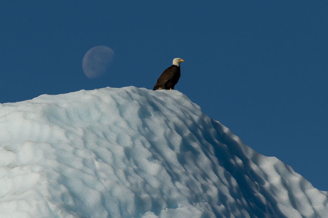 It was a rare day! This is Southeast Alaska and it rains, a lot. It’s a temperate rainforest. There’s a reason why the forests are so green! There’s plenty of daylight and plenty of moisture. Locals laugh about putting seeds in the ground and jumping back to get out of the way. We grow some pretty incredible gardens here. This part of the Inside Passage (also known as the Alexander Archipelago) gets a whopping 130 inches of rain a year. And on summer solstice (just a couple of weeks ago) we got 18 hours and 18 minutes of daylight. Notice that we aren’t talking about sunshine, but rather hours of light. A full day of bright, hot sunshine is so rare that locals call it “severe clear.” We have to dig in the medicine cabinet to find the sunscreen. But today, we awoke to a bluebird day that was stunning: not a cloud in the sky, not a ripple on the water. At 7:00 am our Zodiac excursions began, and right off the bat we found something rare – a huge iceberg with a full grown adult bald eagle perched on the top, and nearby was a lovely view of the moon. And with a little careful “cruising for composition” our trusty Zodiac drivers put us in the right spot for the perfect image. It was an outstanding morning of slaloming around cerulean blue bergs using some of our newly acquired photographic skills! And then it was time for Petersburg.