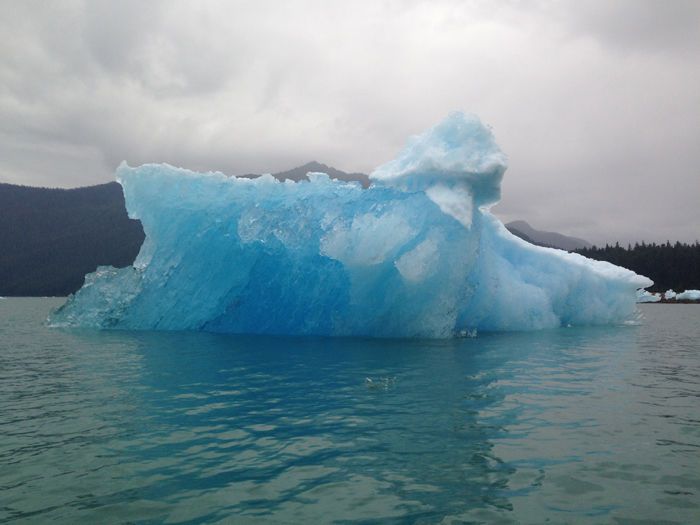 All around us this morning were glaciers, icebergs, and blue and clear ice as we cruised around on our Zodiacs in LeConte Bay. The ice formations fascinated us, and when one of the crystal towers plummeted into the water, the boom and splash created an enormous wave, making our entire Zodiac jump. The ice had many color variations, creating a spectacular display formed by different amounts of debris remaining within the iceberg. There were marbled murrelets (brachyramphus marmoratus) in the water, and, being very skittish, they dove into the ocean. This entire ecosystem is formed by a receding glacier which has made it unique and, although harsh, stunningly beautiful. As beautiful as it is, this environment is vulnerable to climate change, so all those who visit should conserve to protect this for future generations.