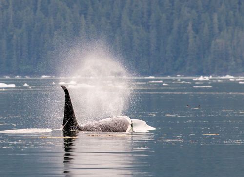 Today, however, a seal or two met an untimely demise. Near the end of our cruise, we encountered a group of orcas swimming with purpose into the mouth of the inlet. At least one large male let us come near enough for an exciting encounter as it came to the surface for air. A few others tailed behind. We had to break contact before witnessing any seal carnage, but we were certain that the orcas were well fed today.
