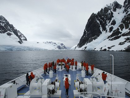 Although we are well on our way along the Antarctic Peninsula, the captivating landscape out the window never fails to amaze. Early in the morning, we continued south through the Lemaire Channel, a narrow and breathtaking gauntlet of beauty. Steep glacier walls rise from the sea on both sides of the ship and witnessing them crumbling into the ocean is a lucky encounter. Wind and rain greeted us at Booth Island, but did not stop intrepid guests and expedition staff for a trip ashore to view the trifecta of Adelie, chinstrap, and Gentoo penguins all at one landing. Meanwhile, divers explored the steep drop below the surface where anemones, sea cucumbers, and notothenid fishes (icefish) live among the carpet of kelps.