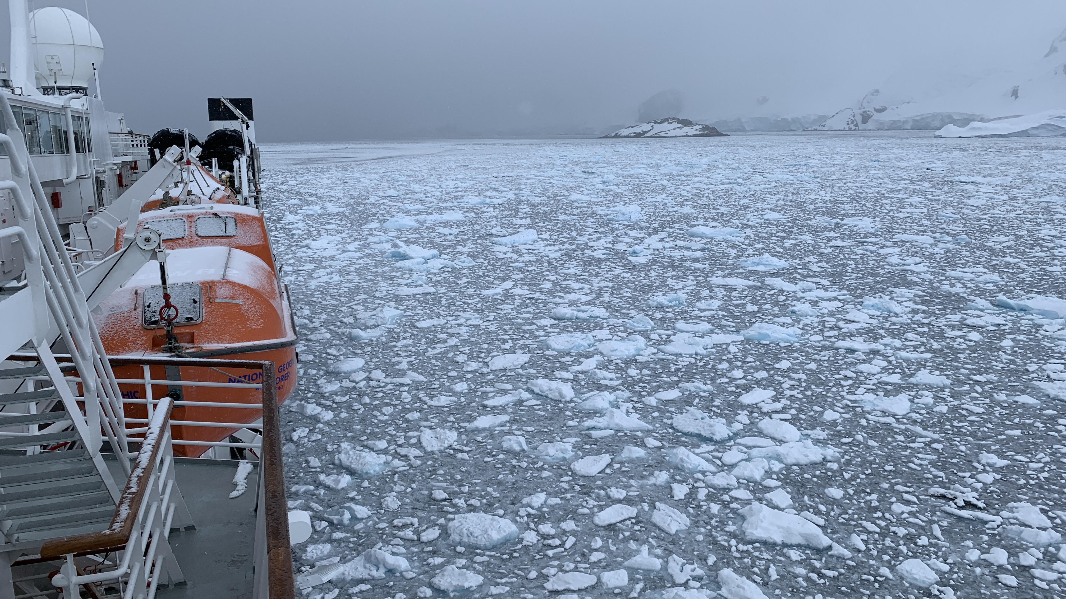 Snow arrived during the night, and we awoke to the surrounding mountains covered in fresh powder! Snow continued to fall as National Geographic Resolution made her way through the Lemaire Channel, blanketing the ship in an ethereal downy covering. We continued through the channel and encountered pack ice. We pushed through before turning around to head to our afternoon destination.