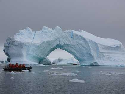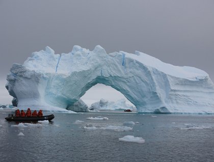 The theme of icebergs continued after breakfast with our visit to Booth Island. Here we had Zodiac excursions to the “iceberg graveyard.” The icebergs stranded in this small bay took the shape of buildings, towers, peaks, and arches. The biggest arches with many shades of blue were our favorites. There was plenty of life to be found among the ice too. We watched leopard seals, humpback whales, fleeting glimpses of minke whales, and of course the porpoising penguins. All of them were here for the same reason—summer riches.