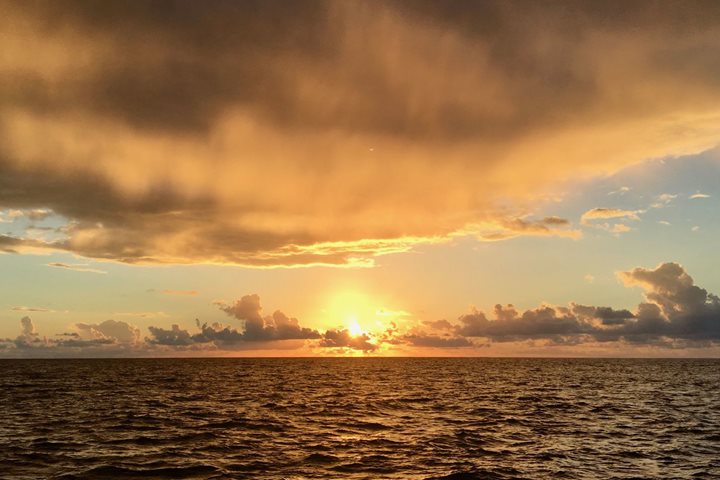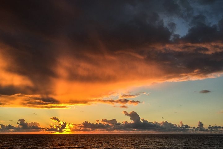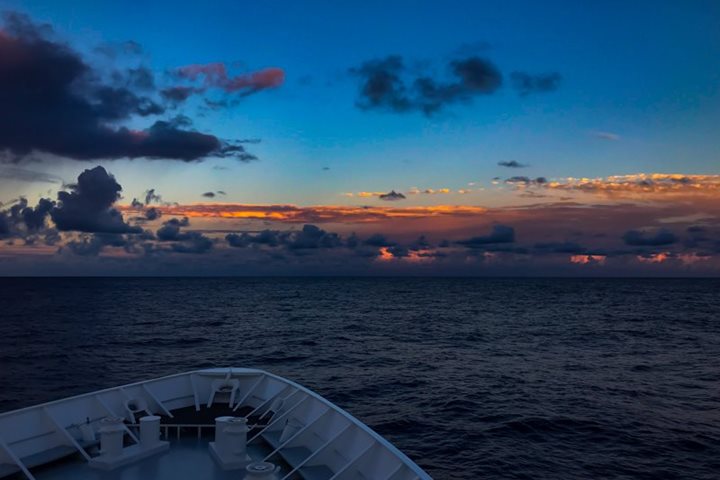 After two fabulous nights on Easter Island it was time to begin the sea portion of our voyage through Polynesia. We boarded our new home last night, and set off to the northwest towards the Pitcairn group. Our journey to our first island, Ducie, will take two full days at sea. A fiery sunrise started our day. After a breakfast on the outer deck, it was time to wrap up our times spent on Easter Island and move on to the plans ahead. We learned about photography, navigation, and Polynesian culture. A few seabirds passed by and flying fish darted off in front of the vessel. But mostly, today was about getting used to the ship, and enjoying the beautiful conditions. Whether out on deck or merely staring out the window, the cobalt blue ocean was mesmerizing.