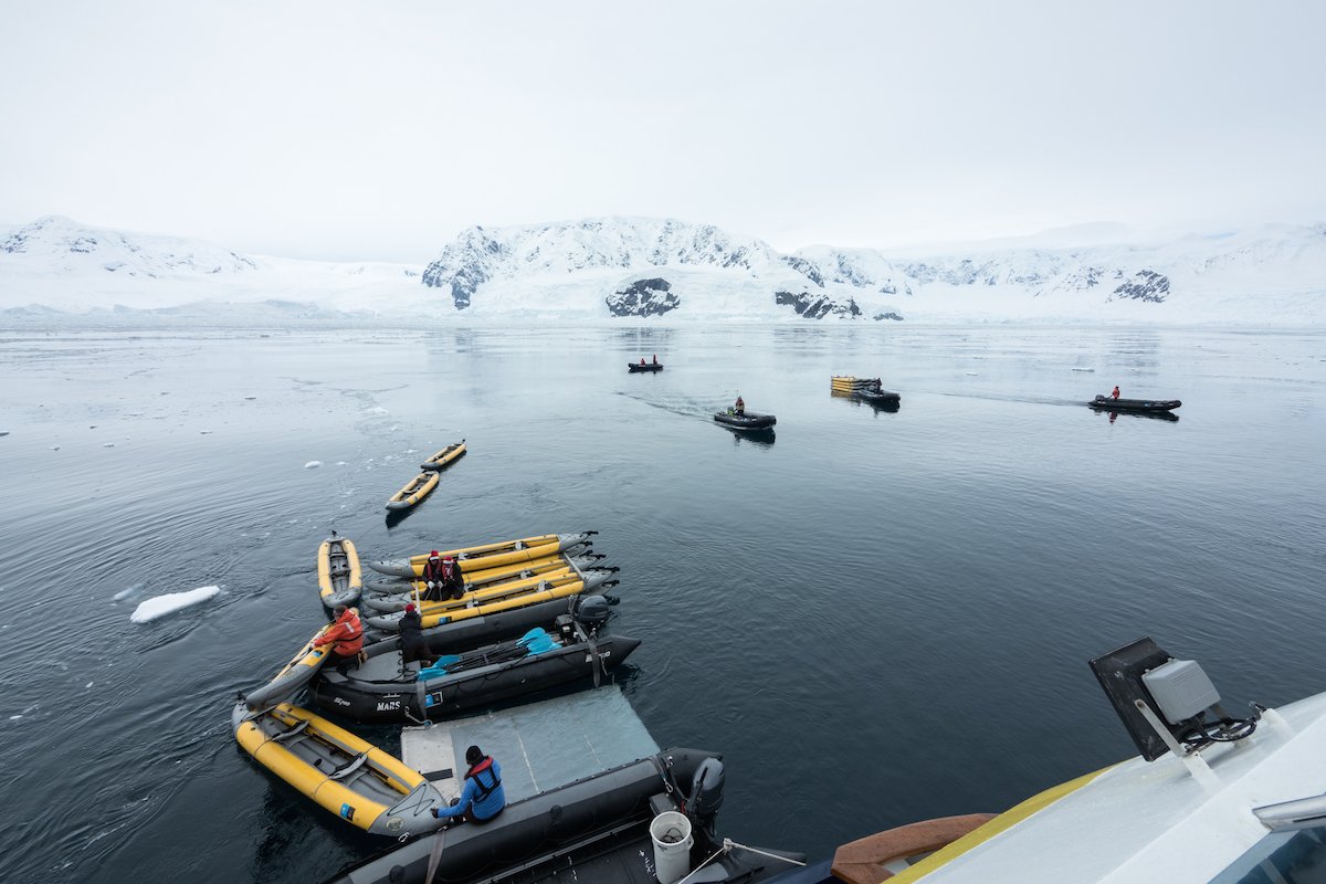 After sailing north in the night from our evening stop at Port Lockroy, National Geographic Orion awoke to a wonderfully white Christmas Eve morning in Lindblad Cove. Brash ice drifted around us in the beautifully calm waters as the glacier-covered peaks rose to meet and blend into the white clouds above. Conditions this nice on our last morning on the Antarctic Peninsula could only mean one thing: Christmas Eve kayaking.