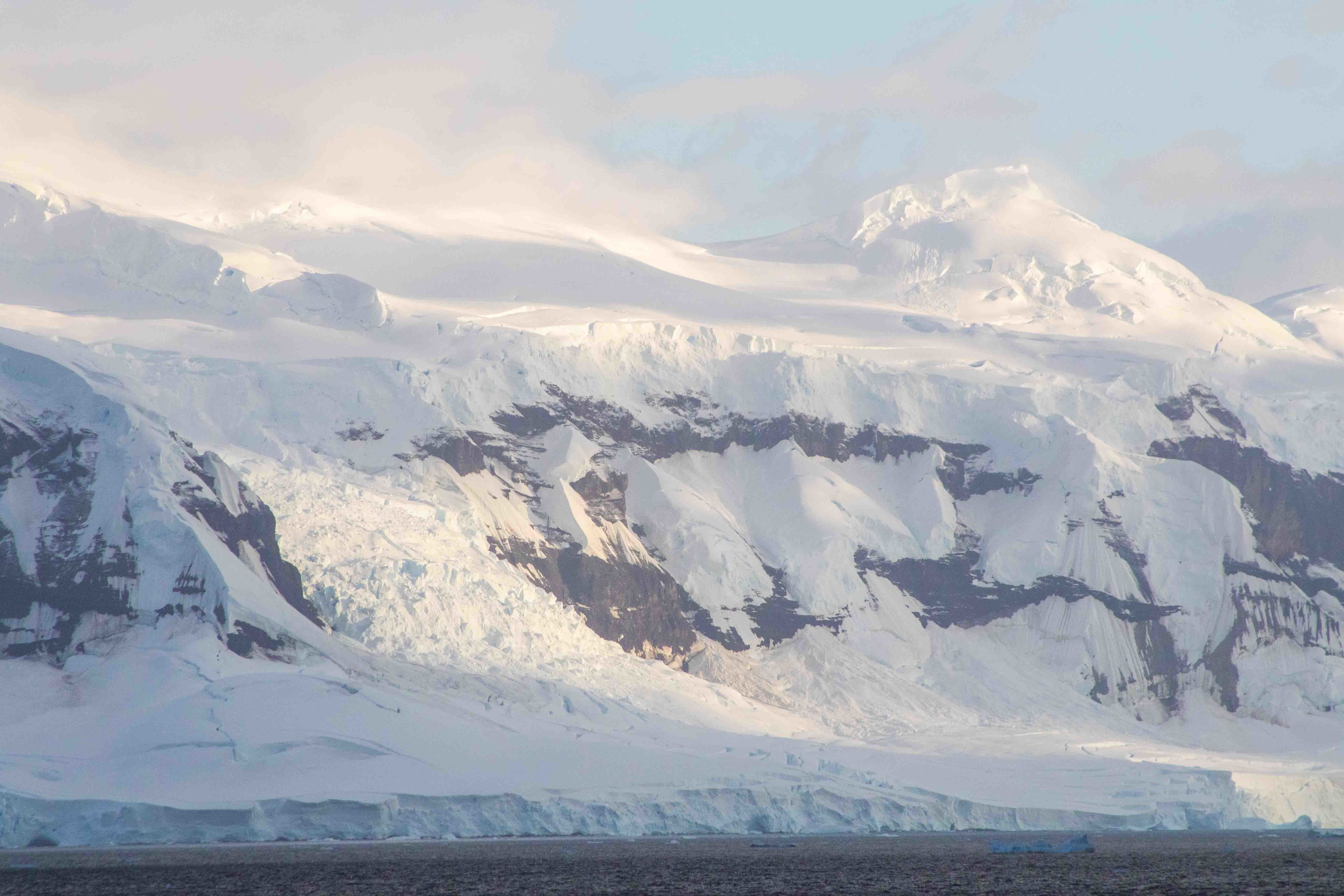 Morning brought higher clouds and no precipitation, though yesterday had not dampened our appreciation for the beauty of the landscape. As breakfast was being served, we slowly cruised into a channel called Lion Sound. We were immediately surrounded by the tall snow and ice-shrouded mountains of Anvers Island and Lion Island. Zodiacs were deployed for an extremely scenic cruise through the sound and along the nearly vertical shores. The sea conditions were mirror-like. Minke whales and leopard seals were spotted by various groups on their routes. With the outboards turned off, the massive silence was punctuated by cracks, booms, and crashes as sections of glaciers fell off the cliffs.