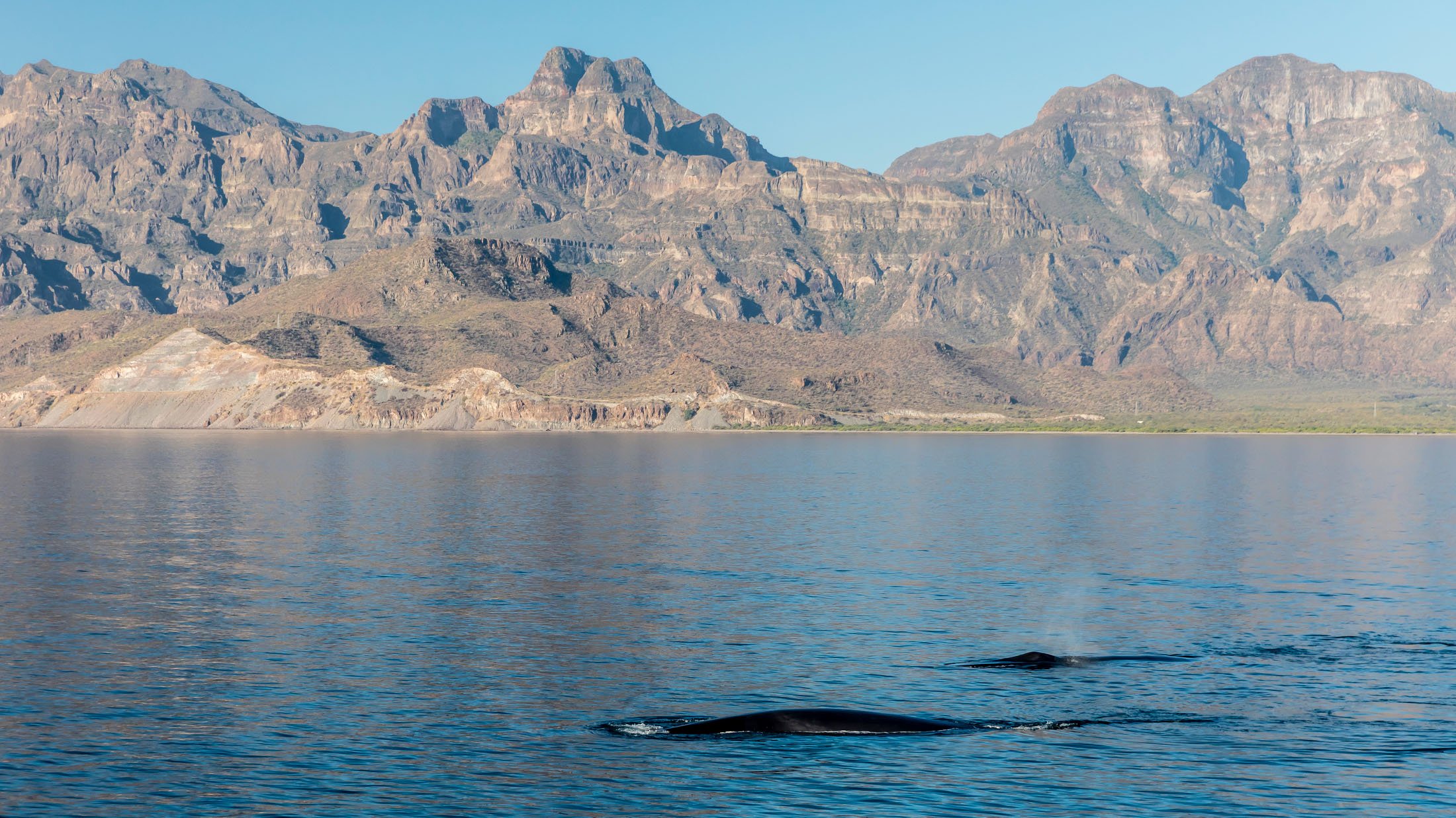 This morning we awoke in Loreto Bay National Park, and soon after sunrise we were watching four fin whales against the dramatic backdrop of the Sierra de la Giganta Mountains. Later in the day we were thrilled to watch four blue whales which at times surfaced upside-down, apparently feeding. The ship cruised close alongside San Ildefonso Island, an important nesting location for many seabirds.