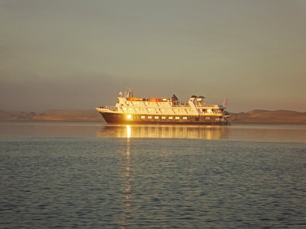 Whale watching at Los Titeres was absolutely delightful this morning at 7 am: the Magdalena Coastal Lagoon was perfectly calm and the sun just came up wrapping the atmosphere with a yellow light that crossed the dense layer of fog. The National Geographic Sea Bird rocked gently on the pacified water. No cold, no wind, no hot sun. These have been the best conditions for observing these magnificent, giant creatures in the privacy of their nursery.
