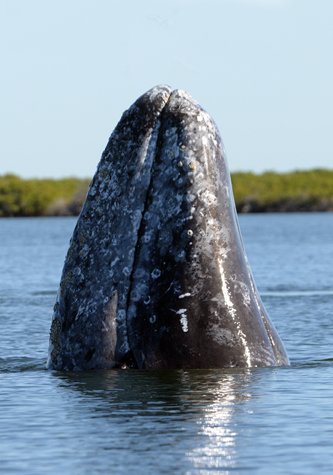 As the sun broke the horizon, the National Geographic Sea Bird lay quietly at anchor beneath a bright clear sky. It was a perfect morning to board our inflatable boats and take off in search of gray whales. We started early to take advantage of our remaining time here. Mangroves and sand dunes flanked the protected channel where distant spouts erupted from the surface. Pairs of cows and their newborn calves seemed to be everywhere. Sunlight glinted off their mottled bodies in the distance. We had the chance to watch these massive creatures go about their daily activities at very close range. Babies rolled near their immense mothers, tails lifted from the water, and heads rose directly up in one spy hop after another. If this were not enough to keep us happy, a very patient and friendly cow and calf repeatedly approached our boats for attention. It is truly amazing that these wild marine mammals will regularly seek out human contact without ever receiving food treats. Long strings of cormorants flew past as we watched the whales, and frigatebirds circled overhead, perusing the scene below.