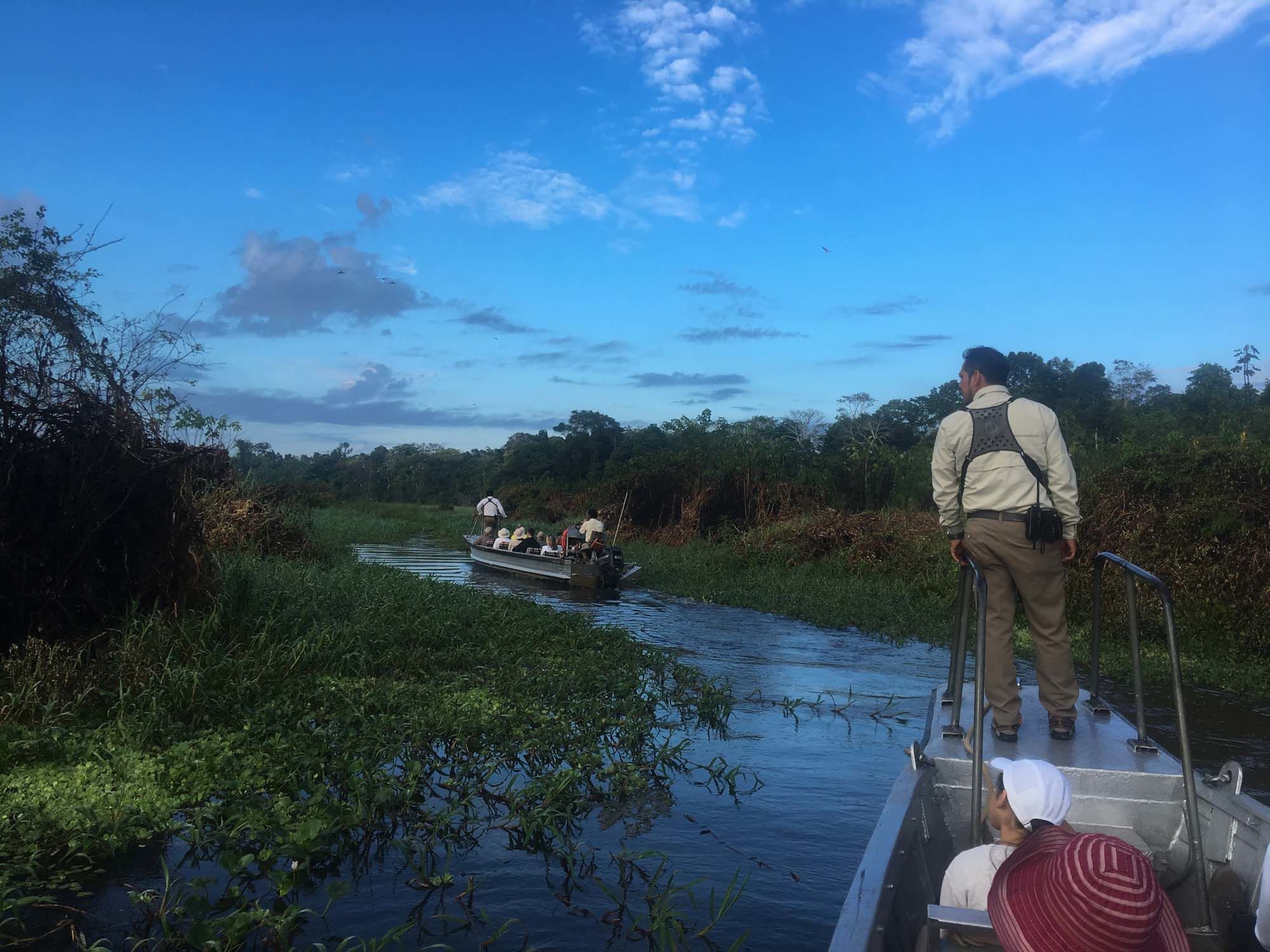 Before breakfast we set out on a skiff ride to a very narrow and shallow Caño that turned out to be filled with wildlife including a very obliging rusty whipsnake and hundreds of birds of different species. We then visited Amazonas, a local community where very well organized and proactive women run several projects. We learned about their fish farms, plantations for wood and food, handicrafts and the way they produce them. Right before lunch we sailed the confluence of the Marañón and the Ucayali, where the Amazon is actually born. We toasted and later continued up the Ucayali, where we are going to spend the rest of our trip. This is the wildest part of the Pacaya-Samiria Reserve and we could notice that already in our afternoon visit to Clavero Lake and a narrow and twisted tributary at its end.