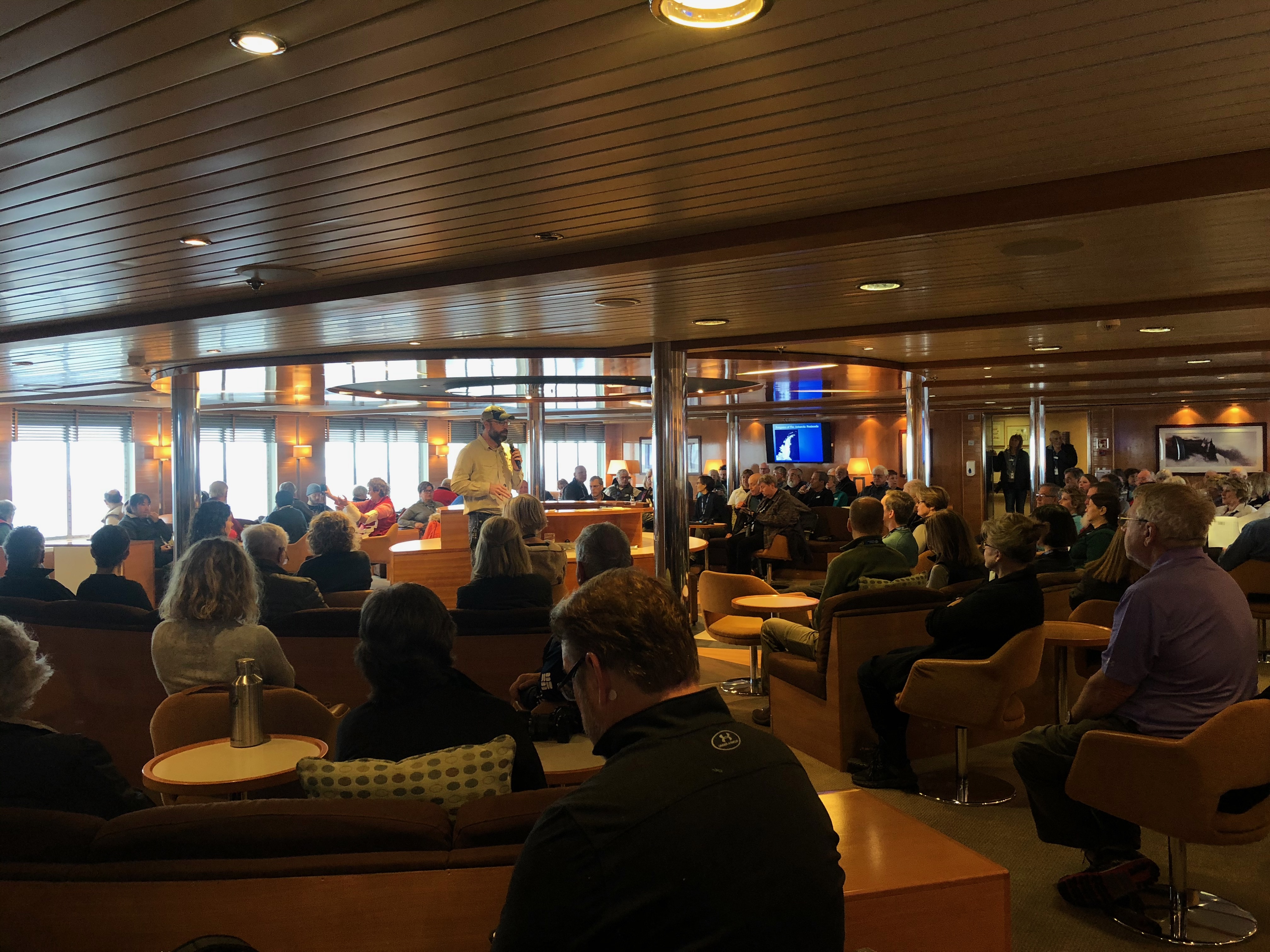 To prepare us for our forays into the land of the penguins, naturalist Doug gave us a wonderful talk called “Penguins of the Antarctic Peninsula,” which focused on the amazing life and times of our soon-to-be penguin friends. He talked about how penguins found mates, had their penguin chicks, and raised them in an often-inhospitable world. He also talked about some of their favorite hobbies: standing on ice floes, collecting rocks, tobogganing on ice and snow, eating krill, and avoiding death by leopard seals.