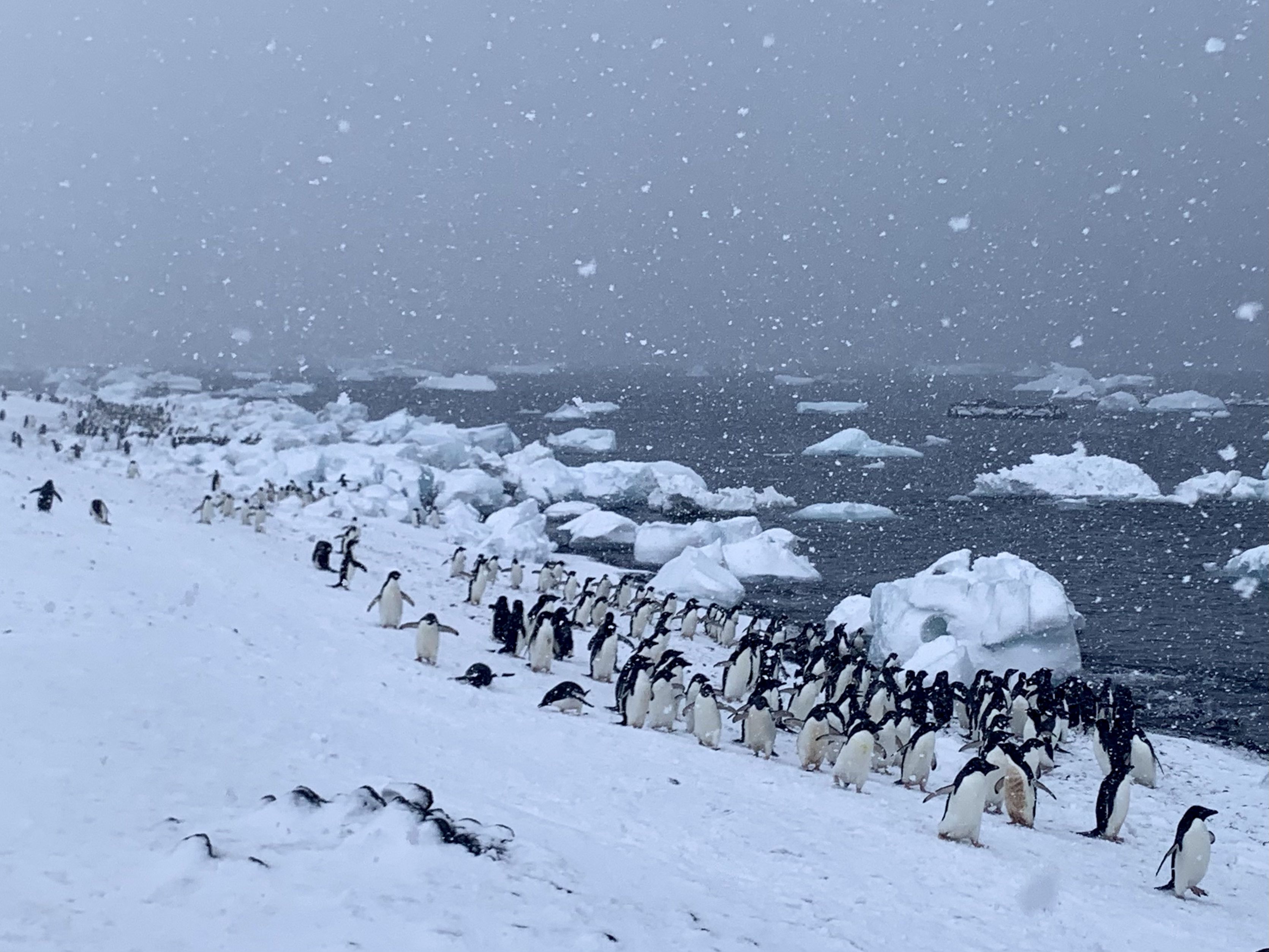 After breakfast, guests set foot on Antarctica for the first time. Rounded boulders of different colors, all of volcanic origin, covered the shore. Several colonies of Adelie penguins were scattered around the high beach, hurrying back and forth between their nests and the shoreline. The most curious of the penguins came closer to us, and we greeted them with multiple clicks of cameras. Several brown skuas nested nearby, and a few kelp gulls observed us from their favorite high rocks. After walking around the penguin colonies, some guests climbed the steep slope of a terminal moraine. With guidance, they safely approached the edge of a melting glacier.