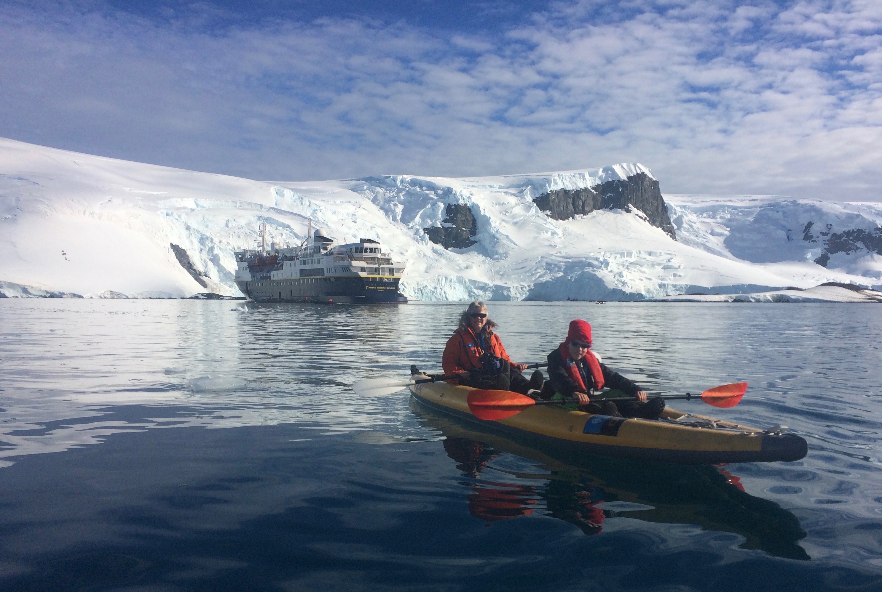 If observing the penguins and seals from shore wasn’t enough to satiate some of our appetites for adventure then today was our chance to try kayaking in Antarctica. This was a first time opportunity for the majority of us and it was a stunning opportunity at that. Absorbing the majestic surroundings of Mikkelsen Harbour from a kayak was a chance to be enveloped in the quiescence of this unique environment. Paddling away from the National Geographic Explorer we enjoyed Antarctica on a more personal level, visiting fur seals along the coastline and watching penguins porpoising past us at eye level.