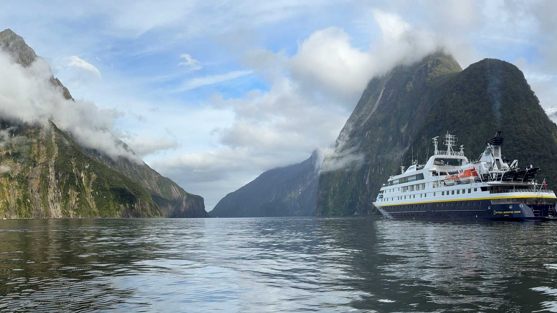 Located on the southwest coast of South Island, Milford Sound/Piopiotahi is a fiord within Fiordland National Park, Piopiotahi Marine Reserve, and the Te Wahipounamu World Heritage site. This stunning fiord was carved by glaciers and exposed during the last glacial retreat at least 7,000 years ago. It left behind stunning peaks as high as 5,500 feet, water deeper than 900 feet, and cascading waterfalls everywhere.