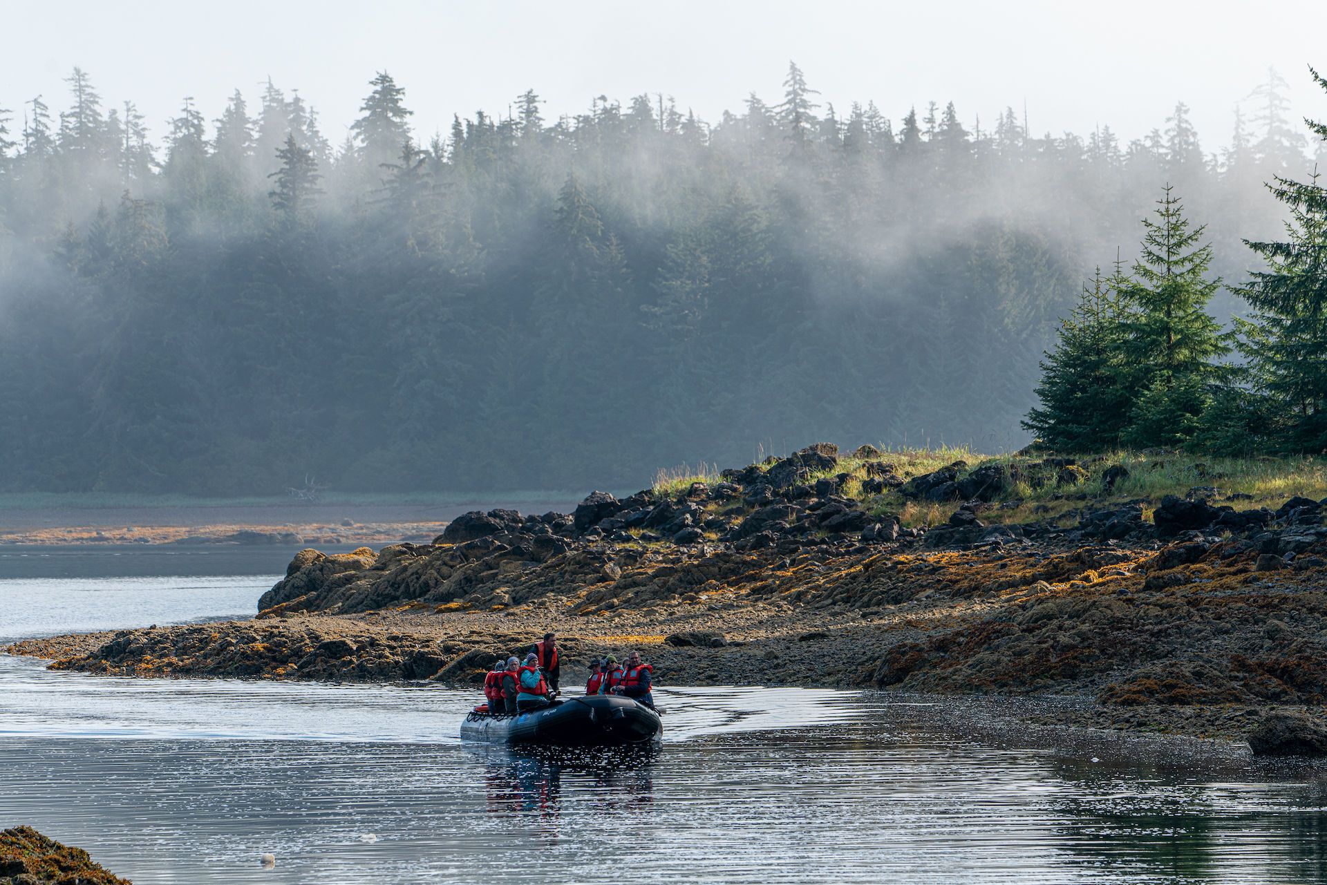 The wind was calm in Rudyerd Cove and the sun was shining. Although Misty Fjords are “supposed” to be misty, this day we were blessed with sunshine and warmth. Surrounded on all sides by the immense enclosure of solid rock, we took to the inflatable boats, kayaks and stand-up paddleboards for an afternoon of exploration and pure enjoyment. The freshwater river that enters the cove was packed with spawning salmon and a few bald eagles adorned majestic Sitka spruce trees in anticipation of a salmon meal. Near the entrance to the river, dozens of harbor seals began to haul out on the sand spit with the falling tide, also anticipating a fine salmon dining opportunity. Here in Rudyerd Cove we were introduced to some new tree species that are more typical of British Columbia and Washington than Southeast Alaska: the red cedar and the red alder. Each one of us had the opportunity to take a cruise by expedition watercraft and enjoy the peace of being even closer to the water in a kayak or a few brave ones ventured out on the stand-up paddleboards.