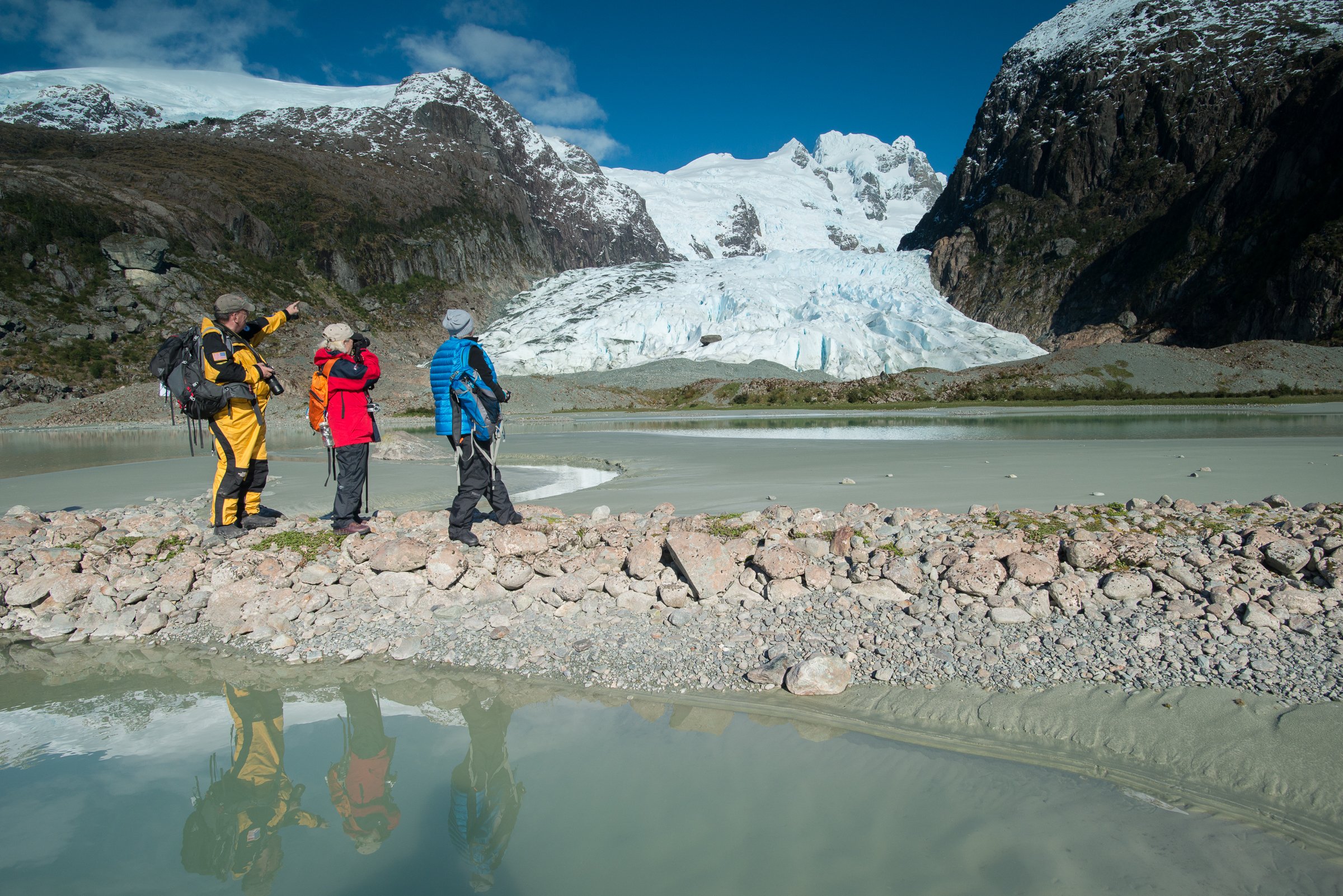 The beautiful weather we all enjoyed yesterday continued today. As day broke and the first rays of sun lit up the snow-dusted peaks we could fully appreciate the narrow Montañas fjord that the ship is sailing along. The rocks along the coastline were mostly well rounded and sparsely covered with vegetation, telling us that once they felt the full strength of huge glaciers which carved out these landscapes. Further in, the slopes rose ever steeper and the tops of the mountains became jagged and covered in ice. More glaciers appeared, some tumbling down to the shoreline. Occasionally huge boulders and smaller rocks could be seen strewn about the shore and as we drew abeam of them glaciers could be seen back from the main coast; these have retreated and small tidal lagoons could be seen. As the sun rose and the large moon set, we were left speechless at the incredible beauty of the glowing snow and ice, as well as the green and brown reflections from the coastal rocks and trees on the flat calm waters. Off in the distance the mountains were covered by extensive fields of ice.