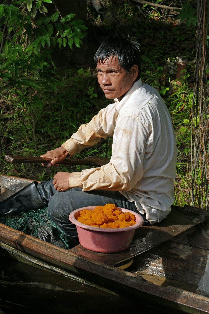 Today is our last full day exploring the Amazon tributaries.  One might think that you have “seen it all” this late in our explorations.  Oh, you can be so wrong sometimes.  The rat snake swimming across the creek at Nauta Caño was certainly a surprise, the tree with three monk saki monkeys was an unexpected pleasure, and the gentleman we found neck deep in the water with his son in a nearby canoe was a curious find.  The gentleman was diving for armored catfish eggs.  The catfish digs a hole in the muddy bank and then lays eggs in the burrow.