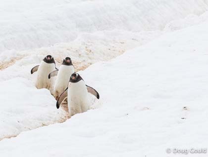 A long, narrow beach was covered with small chunks of brash ice clinking and sloshing around in the shallow water. On the sand, hundreds of gentoo penguins have gathered in what appears to be a welcoming party for us! Soon though, we realized that the birds could care less about our presence; the penguins are here as part of their daily routine of foraging in the ocean and returning to their nest to relieve their mate in the rookery. Penguins share the nesting duties equally, and while one stays with the chicks, the other has a day to go off and find some food and spend a few hours alone, preening, bathing and fishing.