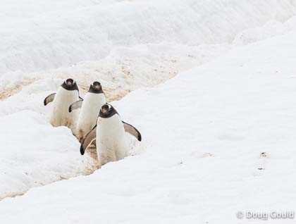 The penguins seem content to share their rookery with us, and even lead the way up a snowy hill to a high lookout, were we can look down and marvel at the view below. A massive glacier adjacent to the landing is like an iceberg factory, constantly dumping pieces of ice into the bay which drift around on the dark water like jewels in an ink pond. Those who made the hike all the way to the top can opt for a quick way down on their bums, or the more leisurely route on two feet.