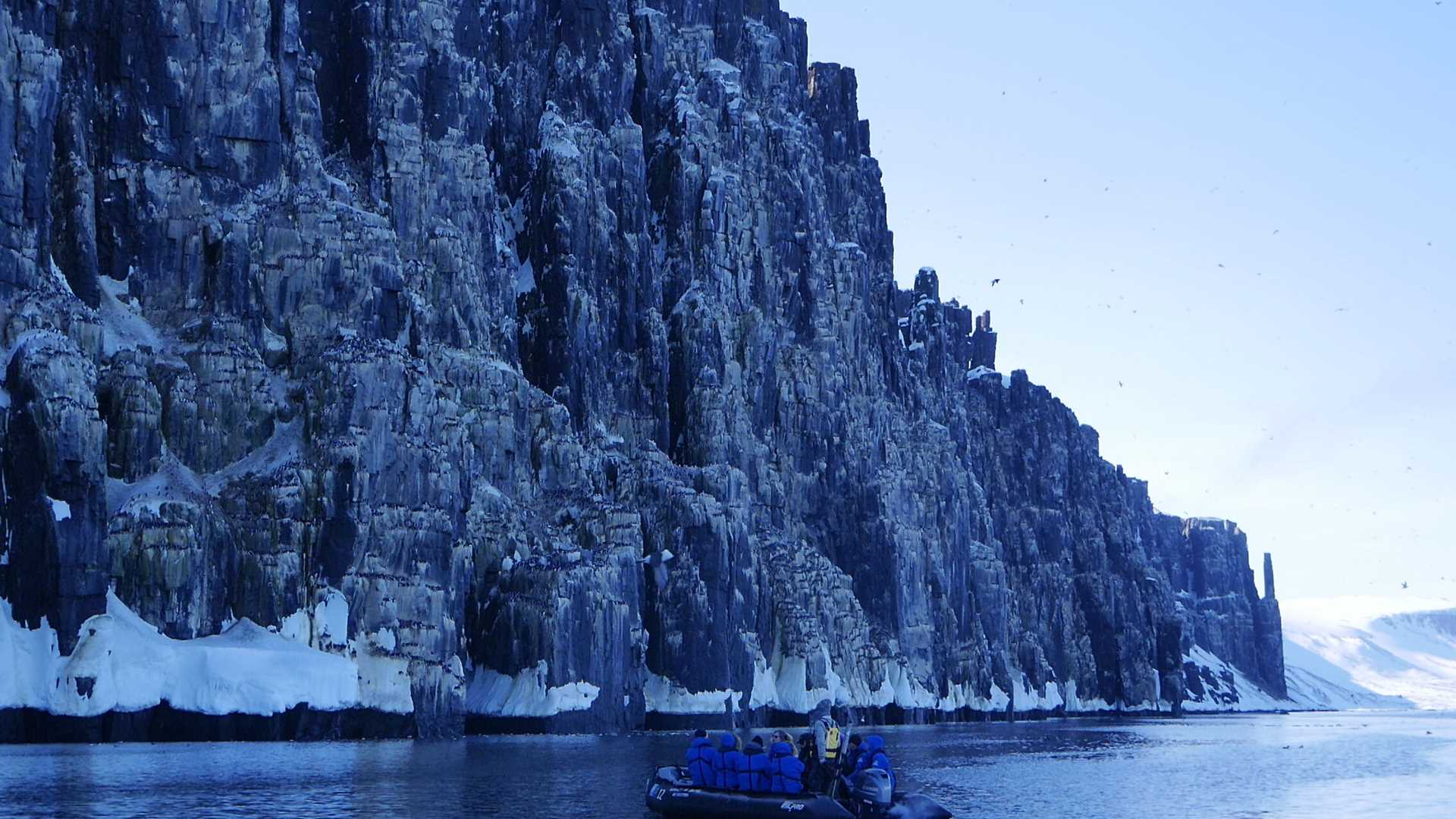 In the afternoon, our Zodiacs cruised past the awe-inspiring cliffs of Alkefjellet in Hinlopen Strait, home to over 60,000 breeding pairs of Brünnich’s guillemots (thick-billed murre), amidst marvelous weather and stunning scenery, painting a picture of the raw wilderness.
