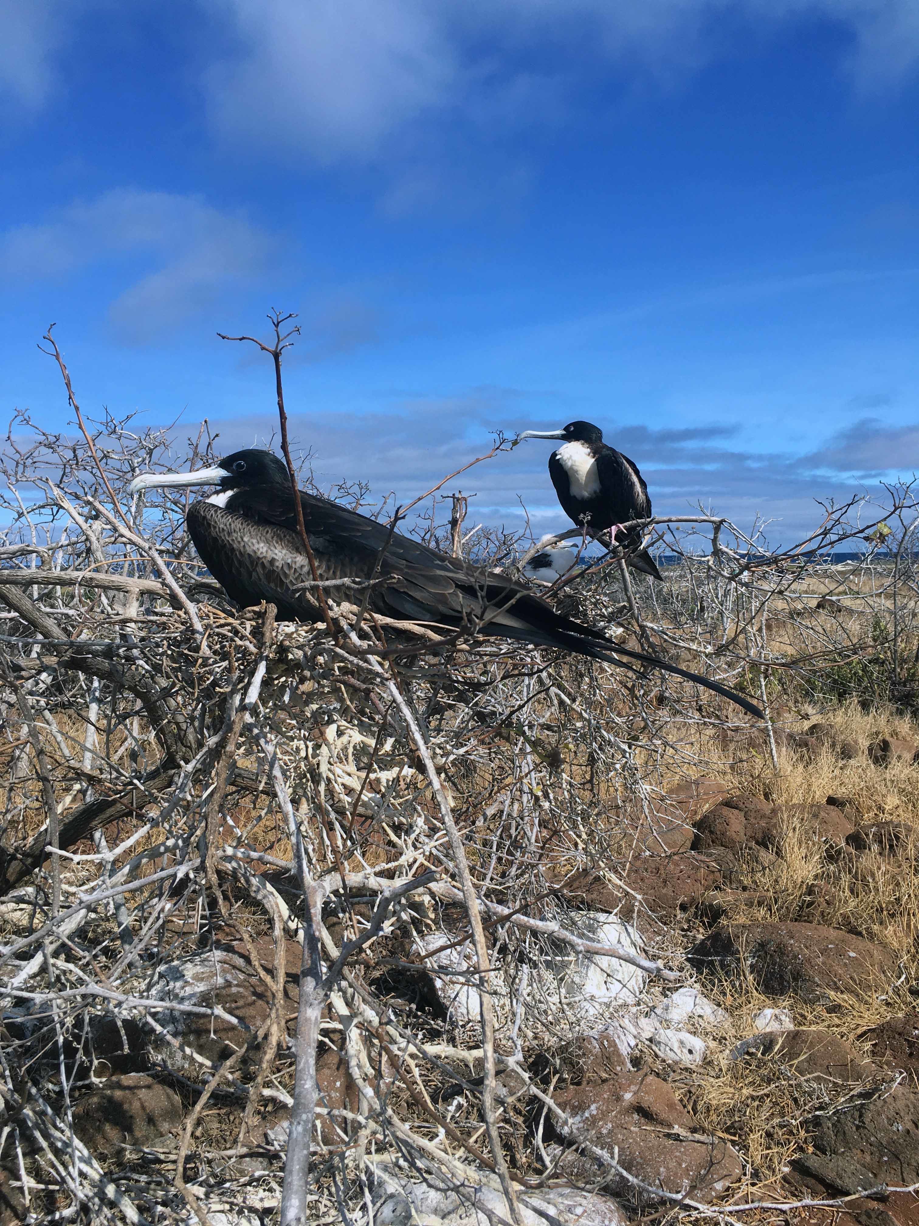 Today, after a delicious breakfast, we went to explore North Seymour, an island of sea birds. To our surprise, we found nests of blue-footed boobies with two babies. Male frigate birds were showing their red pouch trying to catch the attention of females around. We also observed our first land iguanas of the trip.