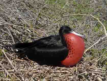 After spending our first night in the Galapagos, we started our activities early in the morning by visiting one of the smallest islands, home of a great number of sea birds and land iguanas. Lying just to the north of Baltra, North Seymour is a flat and low island consisting of uplifted sea floor. It was covered with dry vegetation, mainly dwarf Palo Santo trees and sea shore bushes such as salt bush and sesuvium, whose red leaves gave a special contrast with the blue ocean. We walked along the boulders observing dry vegetation everywhere, with magnificent and great frigate birds nesting on their branches, producing their unmistakable calls, making it easy to distinguish one from each other. Land iguanas rested along the boulders, just observing us indifferently while juvenile blue footed boobies walked along the ground, flapping their wings as practice to be ready to fly in a few weeks.