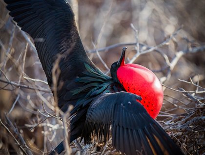 Our morning outing today started early, in order to take advantage of the best light for photography. The small island of North Seymour, which was named after an English nobleman “Lord Hugh Seymour”, has an area of 1.9 square kilometers (0.73 sq. mi) and the highest point is 28 meters (92 ft.) This is a small island, but it is home to a large population of blue-footed boobies, swallow-tailed gulls and frigatebirds. The ecological impact over the years has been minor, and we were delighted by the courting displays of frigates and boobies that were looking for mates. This behavior is rare at this time a year, but it seems that the raining season has been delayed and these birds are taking advantage breeding earlier than usual. The outing was exhausting, but worth it every single step under the equatorial sunshine. Land iguanas, outstanding with their colorful skin, were neighboring the cactus and Parkinsonia forest.