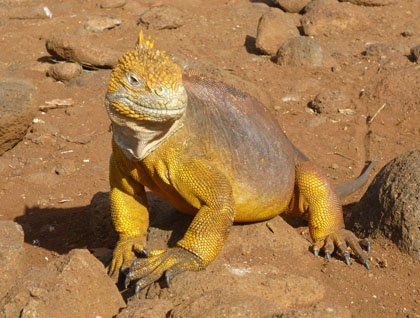 As we approached North Seymour this morning, we could see frigatebirds gliding along the coastline, including a couple of immature male frigates with a partially inflated red pouch, followed by juveniles and females. After landing, we spotted a couple of swallow-tailed gulls that have begun to nest here. As we continued our hike, lands iguanas came across the path every 3 feet—it was amazing to see how the males where strutting in front of the females, who would not even turn to look at them!