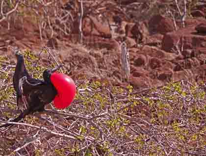 Heading inland through drab vegetation, we are surprised at the density of life, as land iguanas walk among us and frigatebirds soar overhead. Blood red dots are an incredible contrast against the clay-colored terrain and occasional patch of green. Great and magnificent male frigatebirds have inflated their red gular sacs to attract possible mates. Young frigatebirds sit in their nests, trying to make their own shade to regulate their temperature, as they wait for their parents to return with food. Lava lizards flit across the trail, and we hear an occasional Darwin’s finch making a high pitched screech in the distance. This island was uplifted from the depths of the ocean, and all that we witness now has been a relatively recent succession of life that is incredibly vibrant.