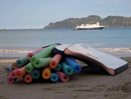 As we break through to the outer coast, a light breeze cools us from the strong equatorial sun that is beating down upon us. As we pass a breeding colony of frigatebirds, we observe a female magnificent frigatebird make a few passes overhead before landing in front of us. After a persistent squawk from the chick, the mother regurgitates an instant meal for her chick, and then takes to the air again to continue to search for food. Various skeletal remains along the coast remind us that this is the uninterrupted path of life, and survival can be a struggle for these creatures. Bobbing upon the turquoise waters, we return to the ship to continue our navigation west.