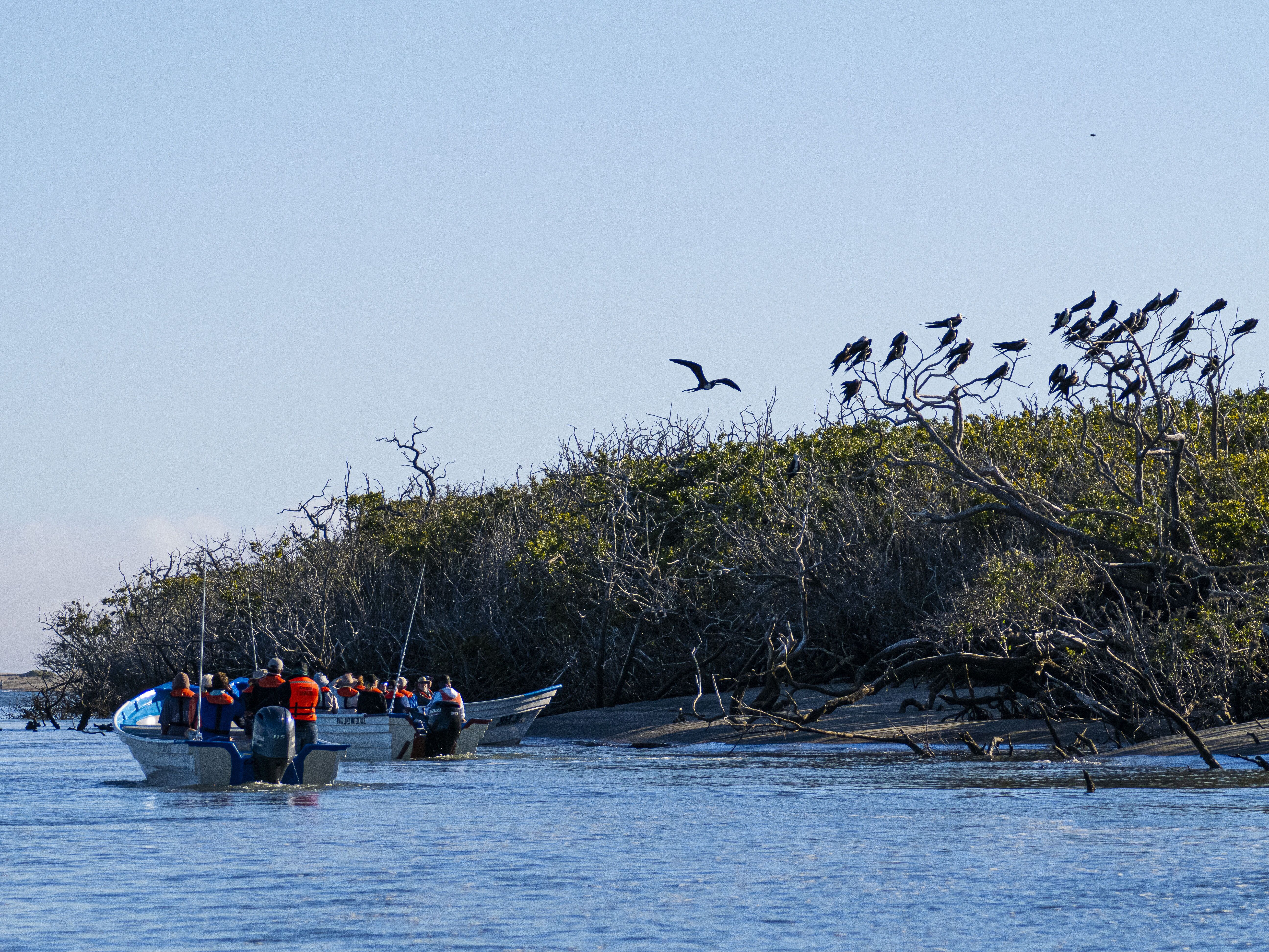Sadly, our expedition aboard National Geographic Gemini is nearing its end. Our day began with a hike at the base of towering cliffs. A steep ascent led us to a plateau of a palo santo forest, sparse and otherworldly. Almost immediately, we were surrounded by red-footed boobies nesting in low trees and Nazca boobies on the ground. A highlight was spotting a short-eared owl perched silently among a lava crevice, camouflaged and hunting storm petrels. The calls of frigatebirds rang in the air, with their inflated red pouches on full display in a mating show. After our hike we enjoyed water activities, such as kayaking along the cliffs and snorkeling. In the late afternoon, we landed on the coral sand beach of Darwin Bay. Guests enjoyed a relaxing stroll along the shoreline bordered by mangroves and nesting bird colonies. The presence of swallow-tailed gulls, lava herons, and marine iguanas provided excellent photo opportunities.