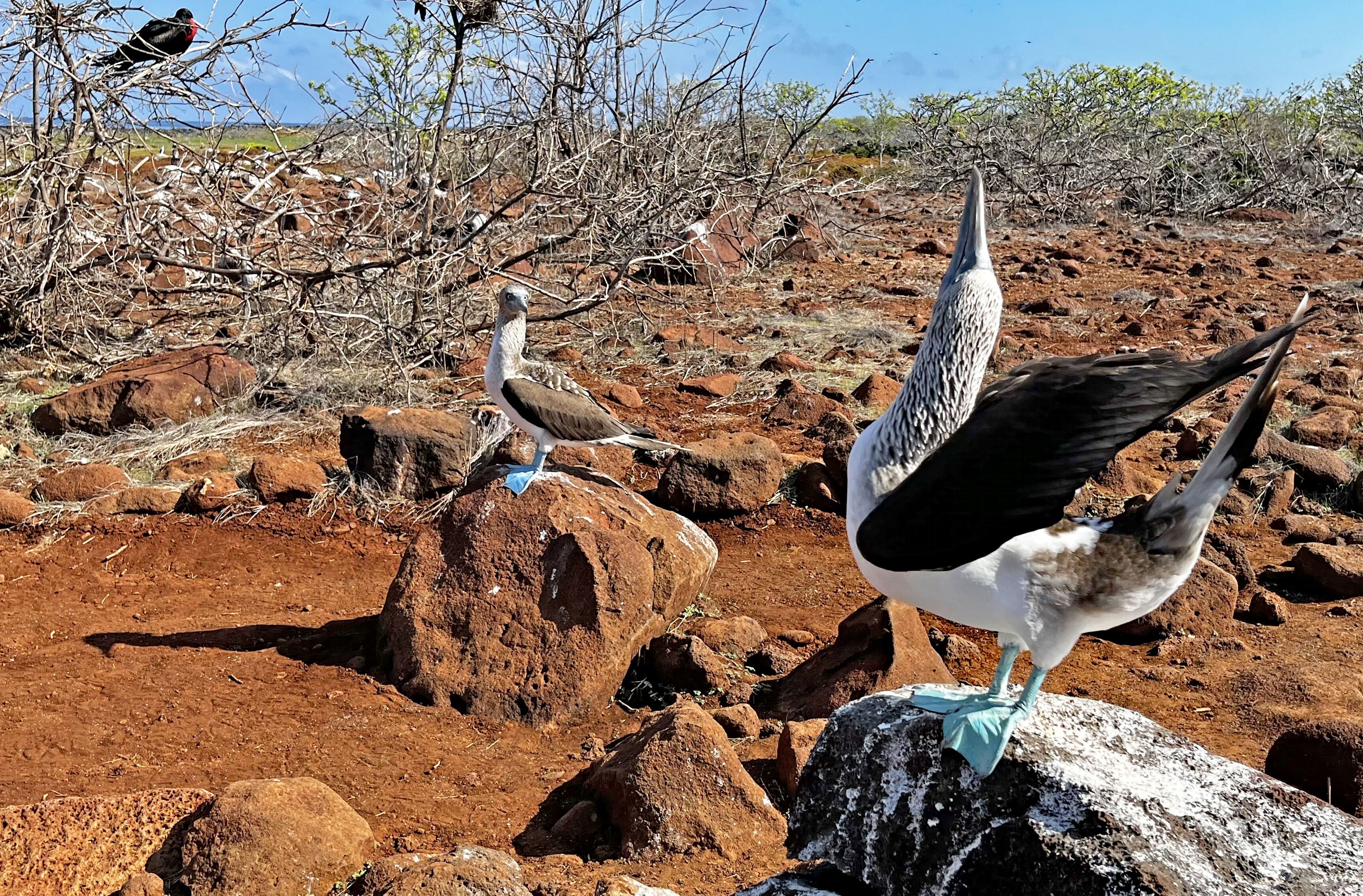 Today we explored a couple of small islands with unique ecosystems. Geologically speaking, North Seymour is an uplifted area. It has two types of sea lions, land and marine iguanas, various land birds, and many seabirds, including blue-footed boobies, seagulls, and frigates that mate all year long. We had a great morning exploring this flat and rocky spot full of wildlife.