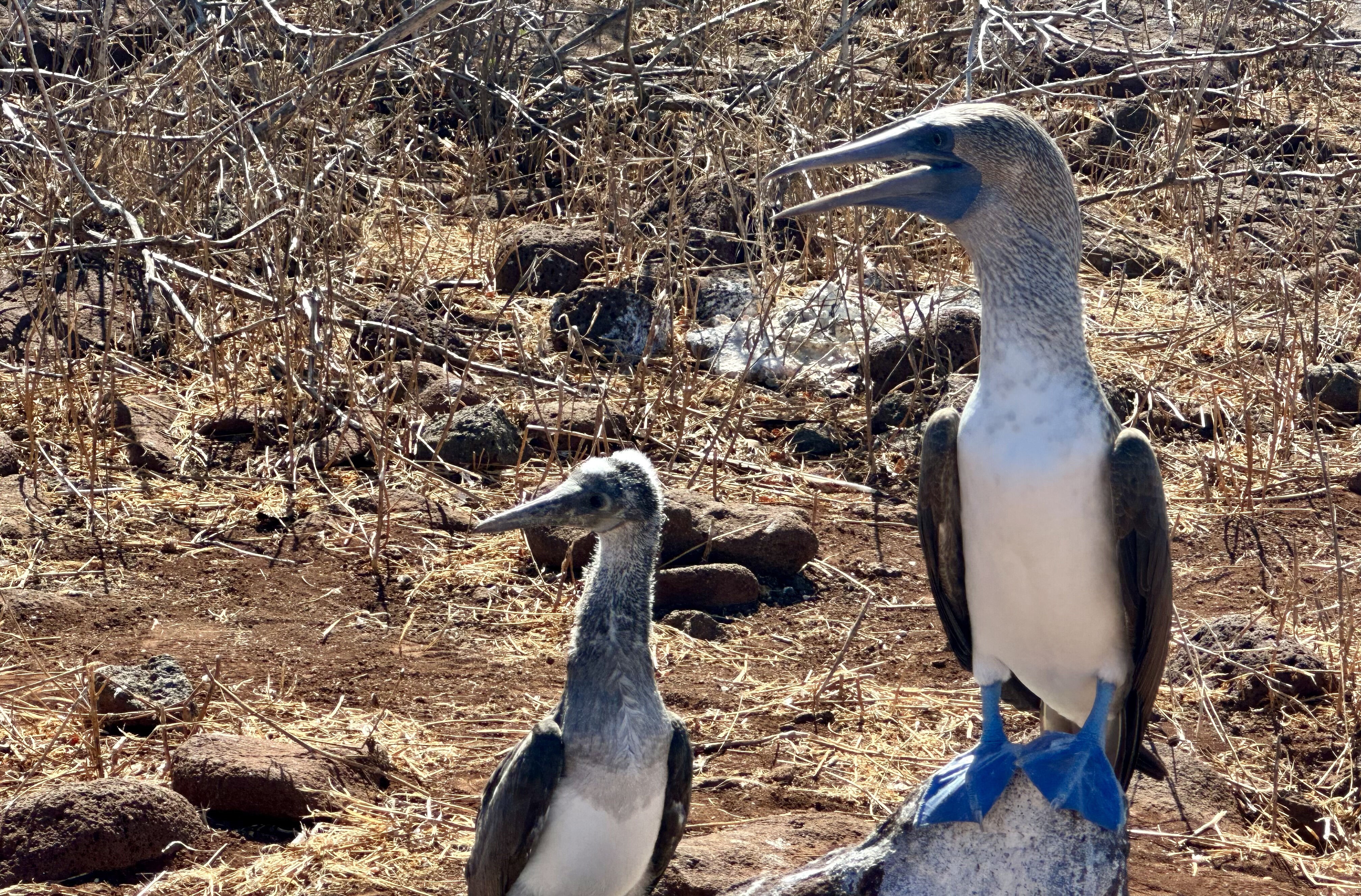 Photo caption and photographer: An adult blue-footed booby with a juvenile. Photo by Franklin Ramirez
