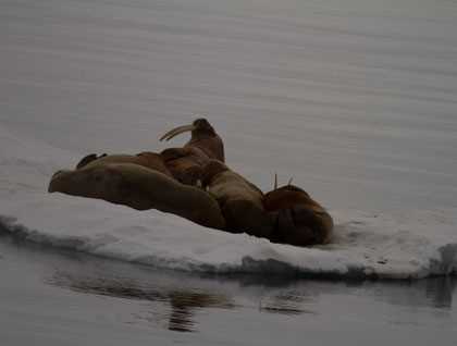 For the afternoon we had our first opportunity to experience Svalbard from kayaks. Many took this opportunity and the water was absolutely mirror calm. Paddling around the islands we also had a chance to view some of the birds preparing to nest on these isolated chunks of rock, including barnacle geese, eiders, and arctic terns. Everyone was also given the opportunity to take a Zodiac cruise. Venturing from the ship we went back to the walrus that were still lounging on the ice floe. Some also spotted a bearded seal as well as a number of species of birds. The afternoon was quite rewarding and the clouds even lifted so we could see the spectacular scenery around this northern fjord of Spitsbergen.