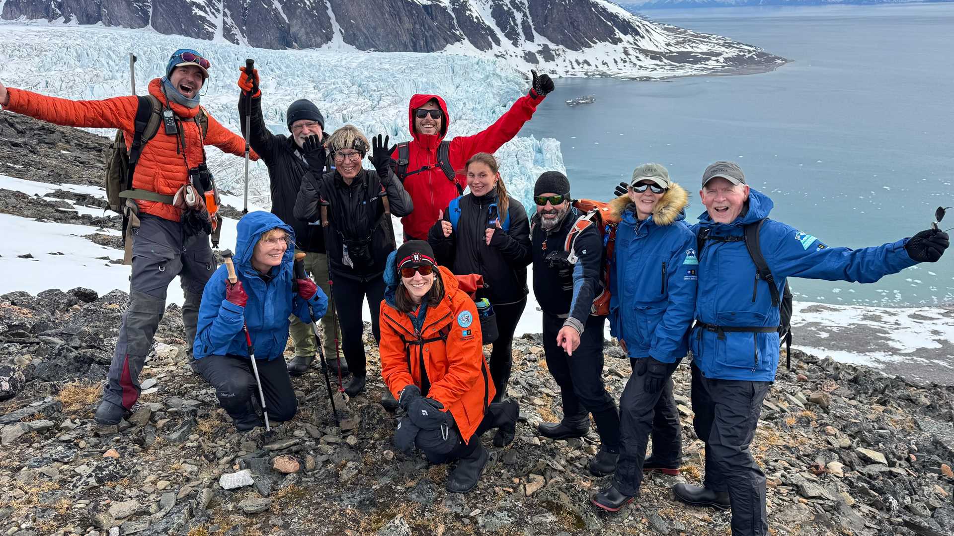 We stopped in front of Nordbreen, the North Glacier, draining the Asgard ice field. Careful scouting by the expedition team found no evidence of polar bears, which meant we were clear for hikes along the beach, moraine, and ridge above the glacier. There were reindeer grazing on the foreshore and ten walruses hauled out on the point. Everyone could choose a hike suited to their desired level of effort, and all had great views of wildlife, the glacier, and its surrounding mountains.