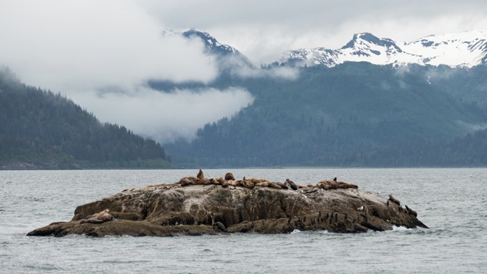 During lunch we motored to the Inian Islands, which lie where Icy Strait and Cross Sound meet. All of the northern Inside Passage fills and empties through this joined channel with every change of tide. Currents are fierce, and nowhere more than in the Inians. While sometimes dangerous, they stir seawater into a rich broth that supports creatures of impressive size, numbers, and charisma. By mini-motorboat, we when out to visit them. This was quite a northwest coast day, and we hunkered down through occasional rain, but the wildlife was worth it. At the Inians’ tip we found sea lions hauled out by the score. Old males, huge and solicitous of their dignity, lay in solitary splendor, each upon his chosen rocky throne. They eyed us with mild suspicion, but generally didn’t deign to pay us much attention. Younger ‘lions sprawled in chaotic piles, or tumbled and soared through the water, approaching us in shy curiosity.