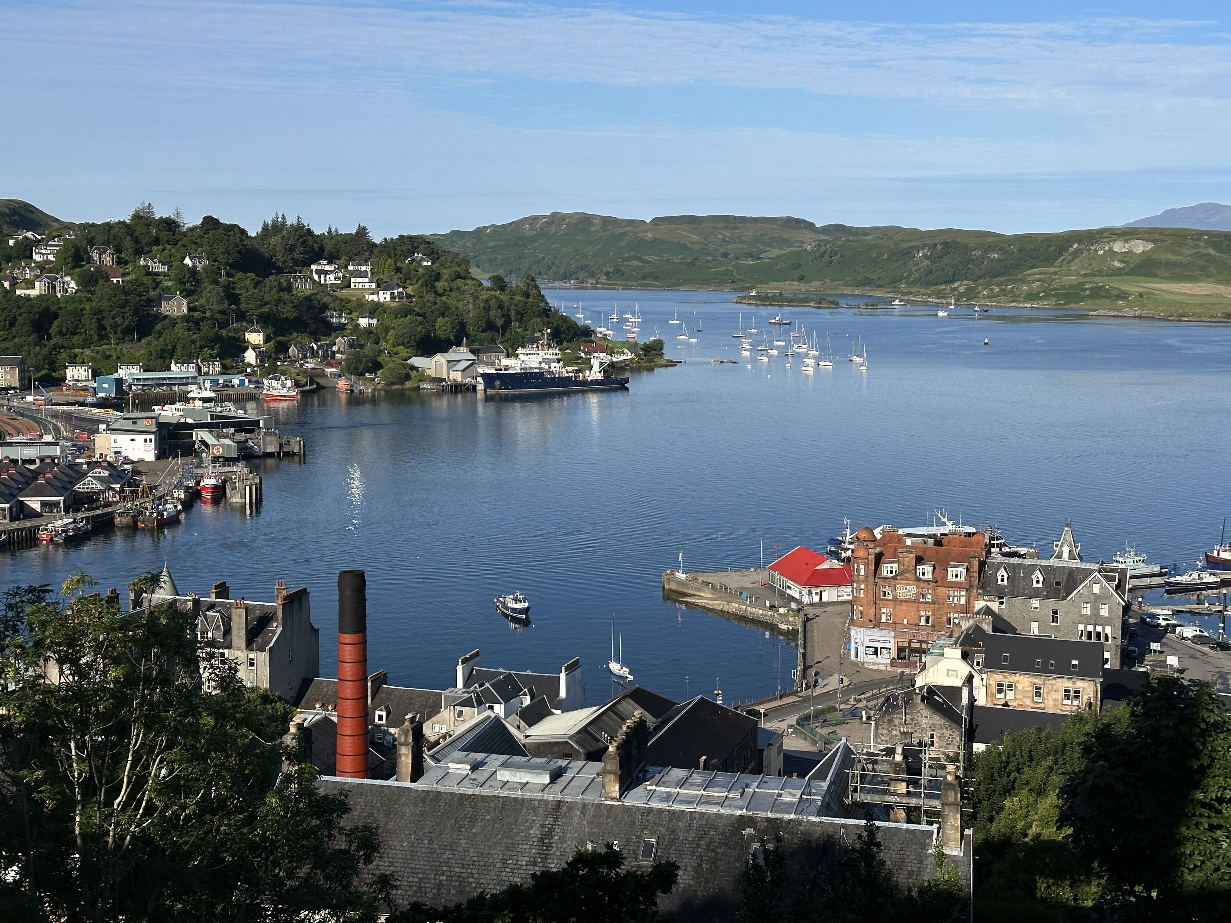 In spite of our early 0800 start, the town was alive already. A bit of a walk found us all alone at the strange and looming edifice. McCaig’s Tower, better known as McCaig’s Folly, afforded not just an isolated green space for contemplation but spectacular views of the town. Not all partook of this particular adventure, as options are always offered. A few touched base with their MacDougall ancestors by stealing a view of Dunollie Castle. Others simply strolled the sea front and slipped into shopping mode.