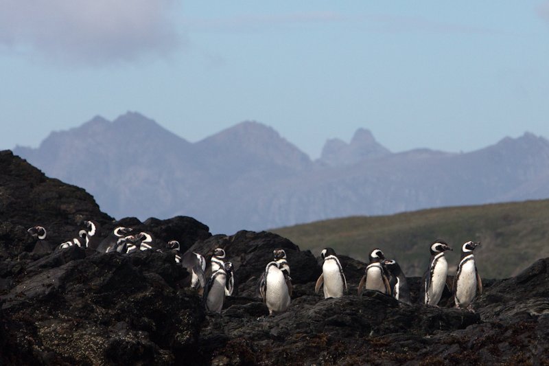 blue-eyed or imperial cormorants. Many Magellanic penguins were running up and