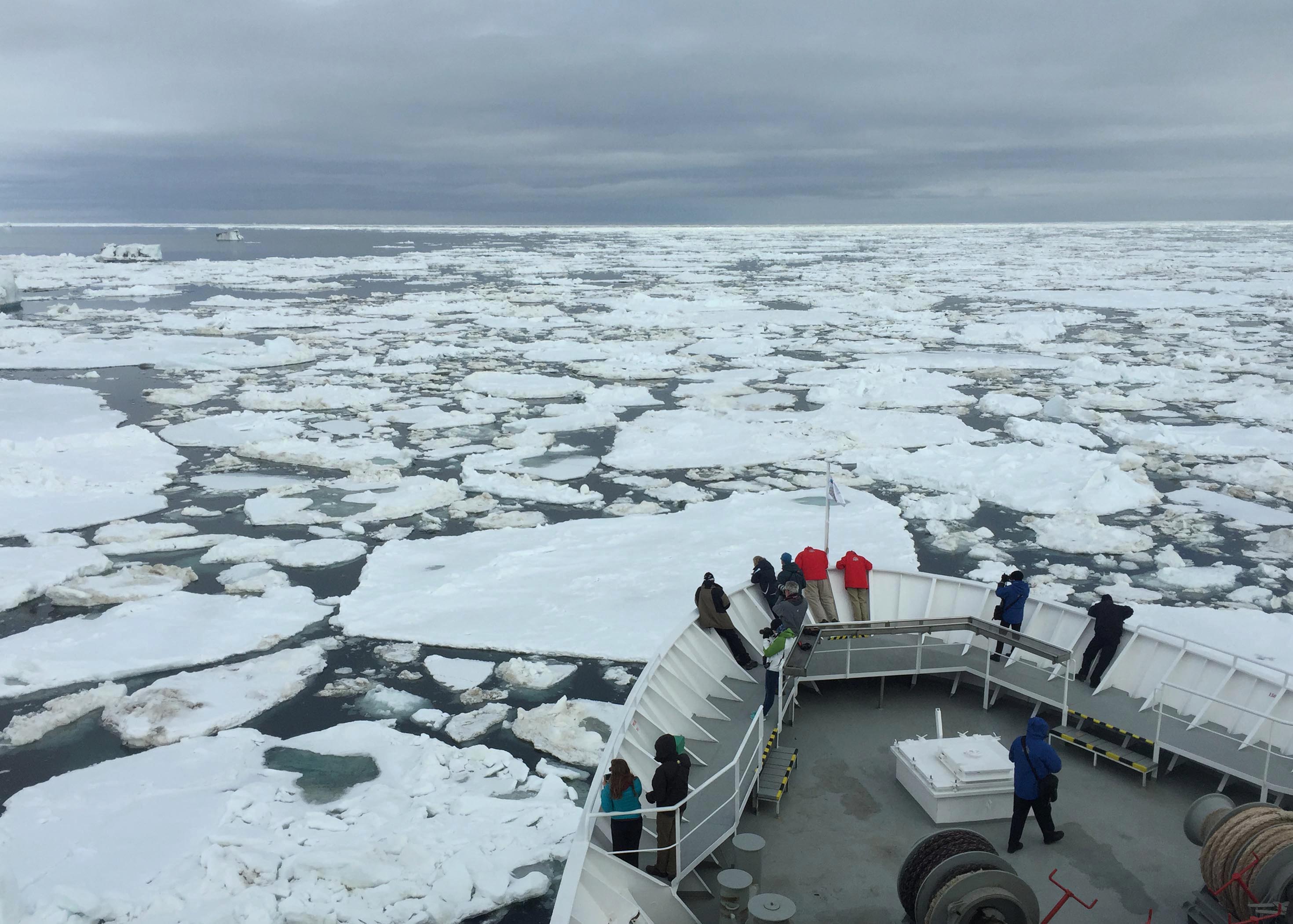 The early risers came up to the bridge as National Geographic Explorer was cruising northwards along the east side of Edgeøya. The weather was calm and slightly overcast. We were in open water of the Olgastretet (“the Olga Strait”), searching for sea ice. A few flocks of Brünnich´s guillemots and single fulmars were seen now and then. But would there be sea ice ahead? Just before seven o´clock we encountered the first ice, and telescopes and dozens of binoculars were raised in search of white, furry things and other wildlife connected to ice.