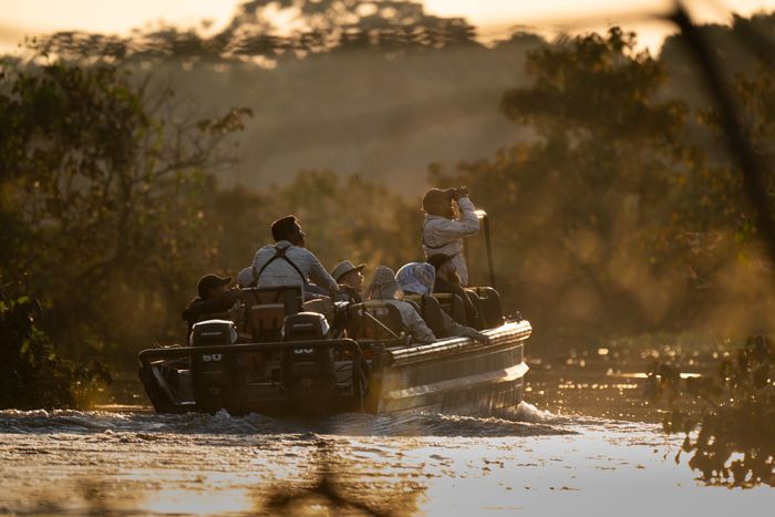 After breakfast most of us changed into swimsuits. It was time to head out for the Amazon plunge. We ventured out to the black waters of the Yanayaco Lagoon. Here the murky, sedimented waters of the main river give way to tannin rich, almost tea-like waters. Complete with brightly colored pool noodles, one after the other we all started jumping from the skiffs to float in the lagoon. Pink dolphins even surfaced nearby! Several minutes and a cold beer later, we were all headed back to Delfin II to rest up and prepare for the evening’s outing.