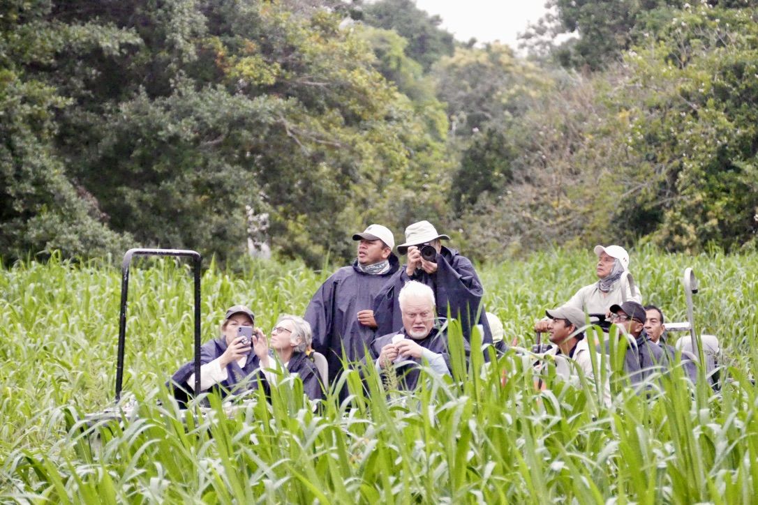Tamandua! The cry went out from our naturalist Jorge early this morning on our skiff ride on Belluda Creek. We craned our necks and adjusted our viewpoints to see this arboreal anteater as it quietly went about the business of gathering its breakfast. Finally, it stepped into a clearing on a branch right over our heads! He seemed to be posing for our cameras, so we quickly took many images for posterity. Tamandua paparazzi! After being delayed for a short time due to a torrential downpour, we set out in our skiffs once again to explore the Dorado River — this time into the darkness of night! Our intended quarries were the wily caimans on the river; their positions in the complete darkness were revealed by the shining of their eyes under our strong spotlights. These youngsters allowed us to get right next to them as they floated on vegetation, just waiting to strike at a fish or other prey!