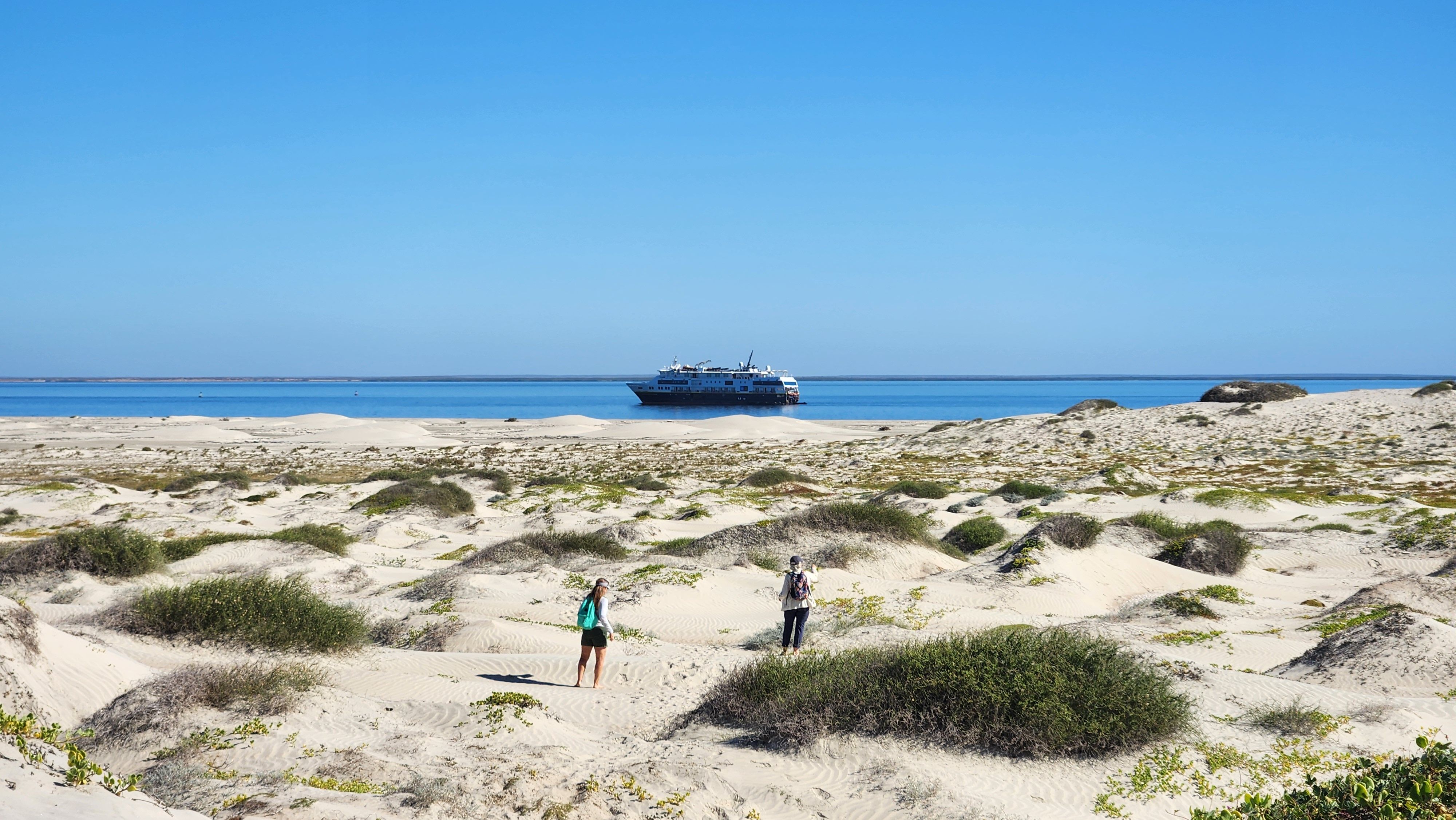 We awoke to a little rocking as we cruised along the southern Pacific coast toward Magdalena Bay. Along the way, we enjoyed presentations by our naturalists: Shannon Malone spoke on ecological management in Baja California, and Jeff Campbell talked about the unique ecology of the gray whale. After lunch, we explored a wonderful part of Magdalena Island. This exotic terrain has a sandbar that is about a quarter-mile wide covered in ever-shifting sand dunes. On the Pacific side of the sandbar is a beautiful beach covered in sand dollars. Afterward, we were treated to the lovely tunes played by musical group Los Cayotes. What a beautiful and relaxing day we had.