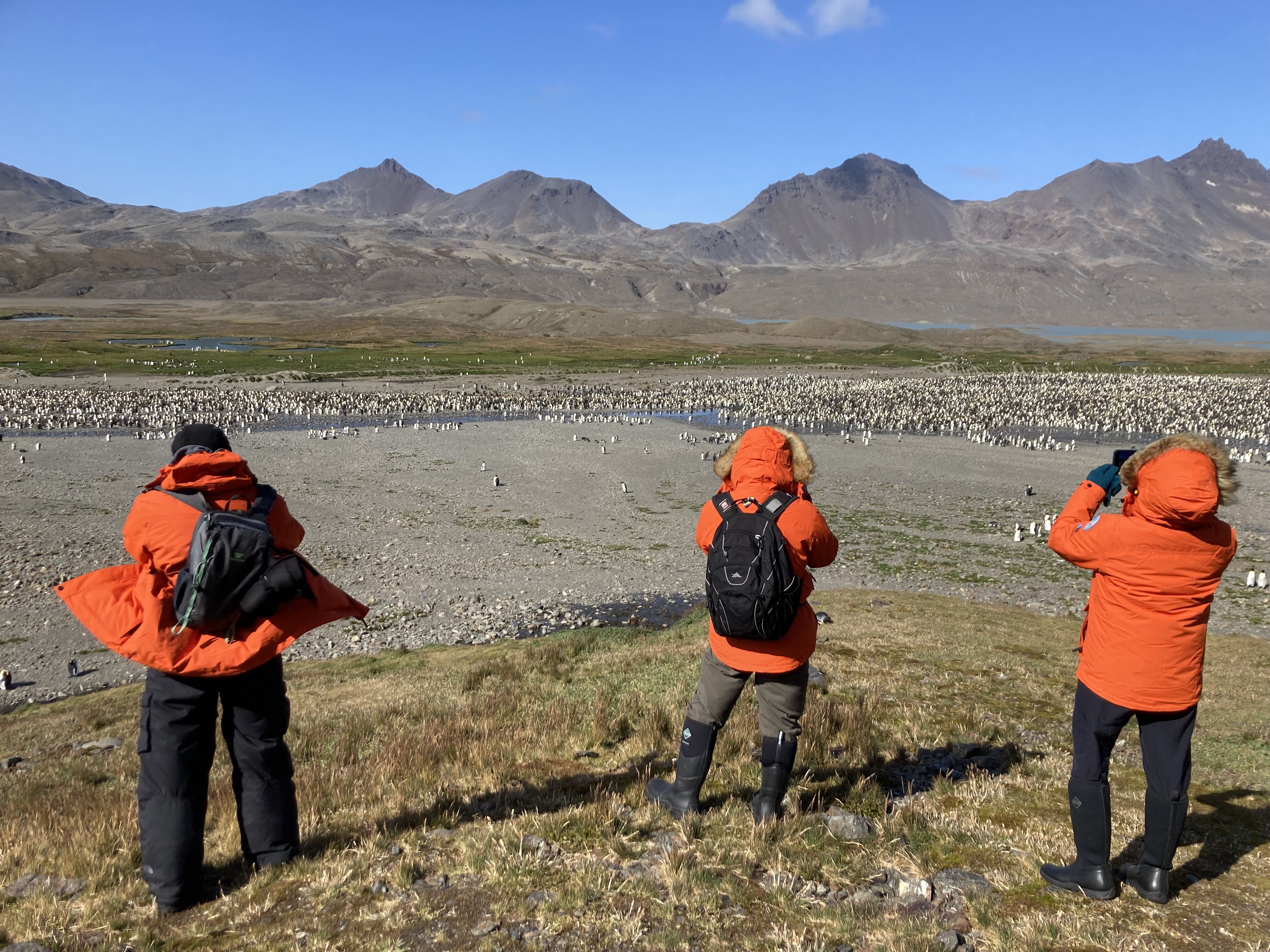 What a fabulous day we’ve had for our last expedition day of this incredible adventure! We arrived at West Point Island’s sheltered settlement harbor after a windy night off the coast of the Falkland Islands. The colony at Devil’s Nose was a spectacular sight and we were so thrilled to get our fix of albatross up close after seeing them following us at sea for so much of this voyage. Black-browed albatross chicks were sitting patiently, waiting for their parents’ return, and rockhopper penguins were quietly completing their molt. In the afternoon, we made our final landing at Marie-Paul and Luc’s beautiful piece of the Falklands, Grave Cove. It was an easy, although windy, walk to the beach on the opposite side of the headland to see thousands of gentoo penguins on one of the Falklands’ most picturesque sand beaches. The waves were crashing, the sea lions were hunting, and Johnny rooks kept us entertained among the penguins coming and going to the sea! It was an absolutely fabulous final spot for our last taste of the Falkland Islands.