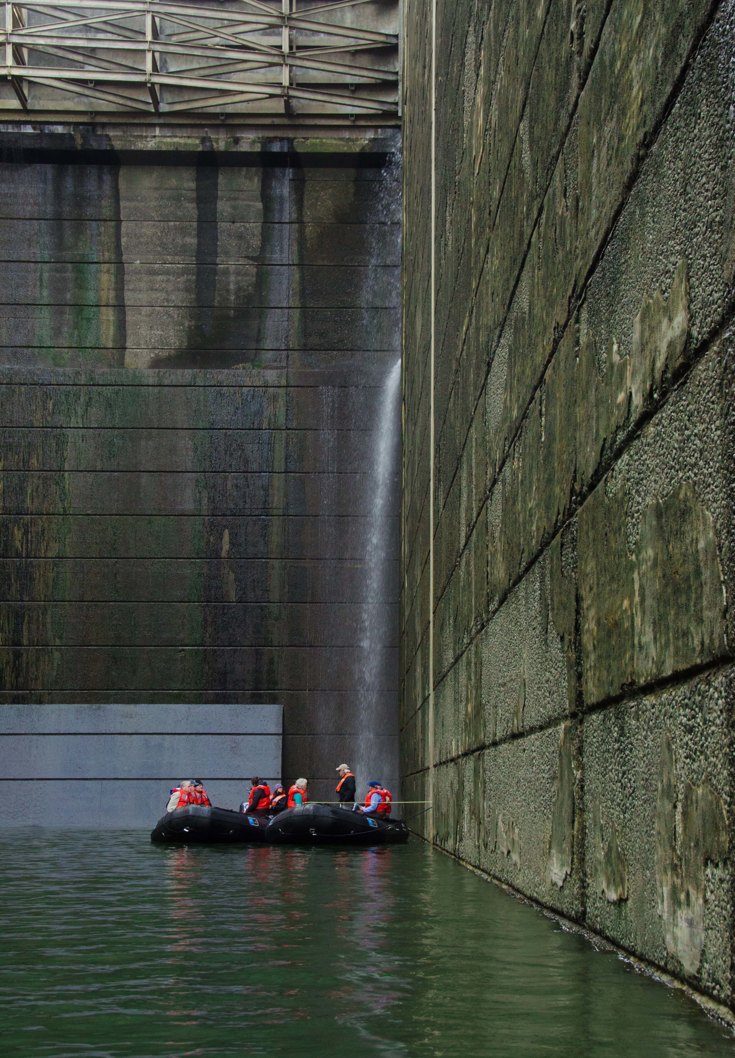 We arose to a beautiful sunrise as the Sea Bird passed through Wallula Gap on the Columbia River. Just after breakfast, we entered the Snake River and proceeded through the lock at Ice Harbor Dam to Lake Sacajawea. Cliffs along the lakeshore displayed excellent views of lava flows, one on top of the other, of the 16-million-year-old Columbia River Basalts. Apple orchards and vineyards topped the basalt cliffs. On the reservoir shores were huge bars from the 15,000-year-old Missoula Floods, with giant current ripples some 250-feet crest to crest. “Lunch in the lock” (of Lower Monumental Dam) was on the aft deck, blessed by beautiful warm weather. In the afternoon we anchored at the mouth of the Palouse River for kayaking, trips on the expedition landing crafts, and a bus excursion to Palouse Falls. We marveled at the gigantic plunge pool produced not by the modern falls but by the torrents of water that coursed across the Channeled Scablands during the Missoula Floods.