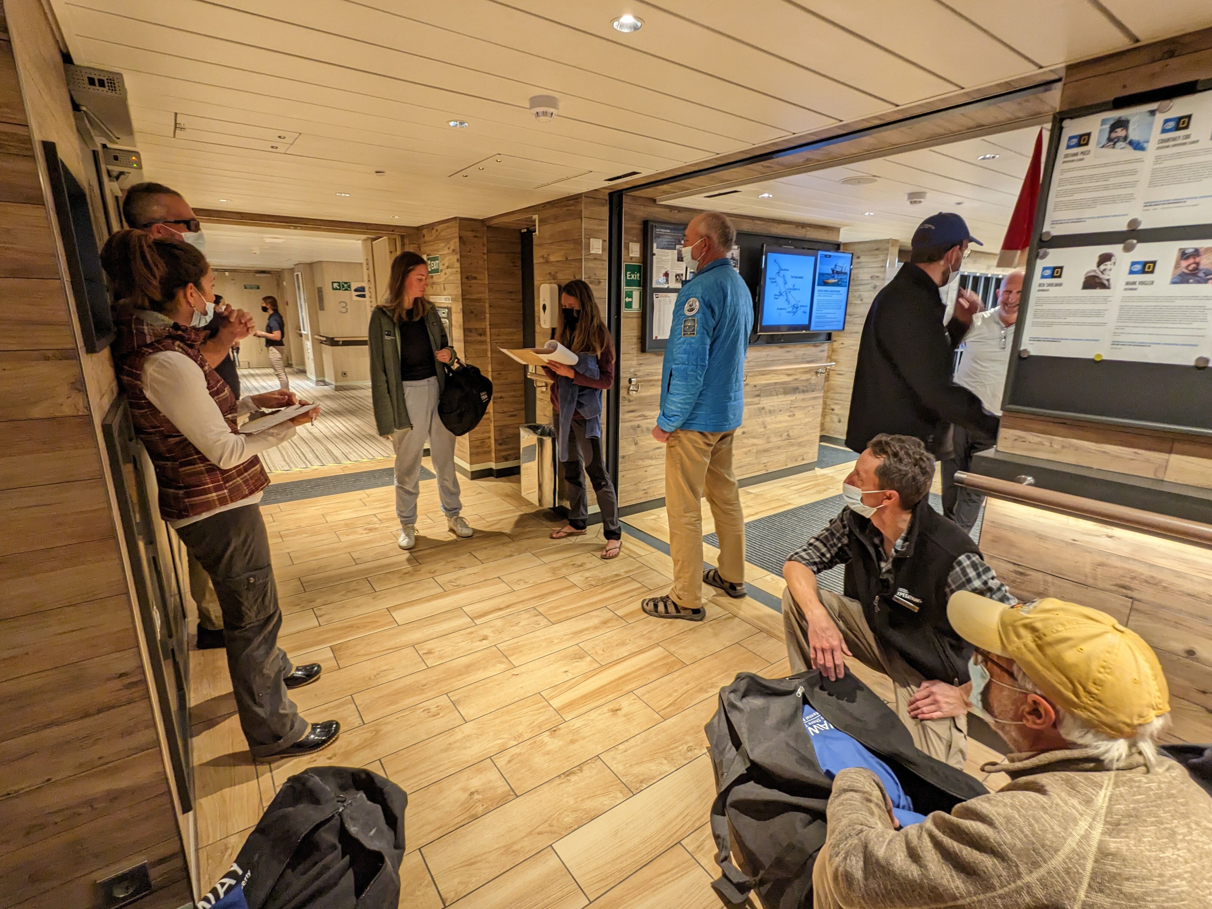 We were up before sunrise this morning to watch the pink glow as it descended over the mountains and glaciers around us. A short hike brought us to the foot of Bernal Glacier just when the colors were at their most brilliant. We had a second opportunity to stand in awe as we contemplated the sheer power of ice needed to carve this beautiful landscape. Back on board, we stretched our minds in an abstract direction with a workshop on the use of watercolor to document our expedition from Naturalist Shannon Malone. Our timing was planned around our passage through the Kirke Narrows. We needed to pass through at slack tide to navigate the strait, which is barely three times the width of National Geographic Explorer .