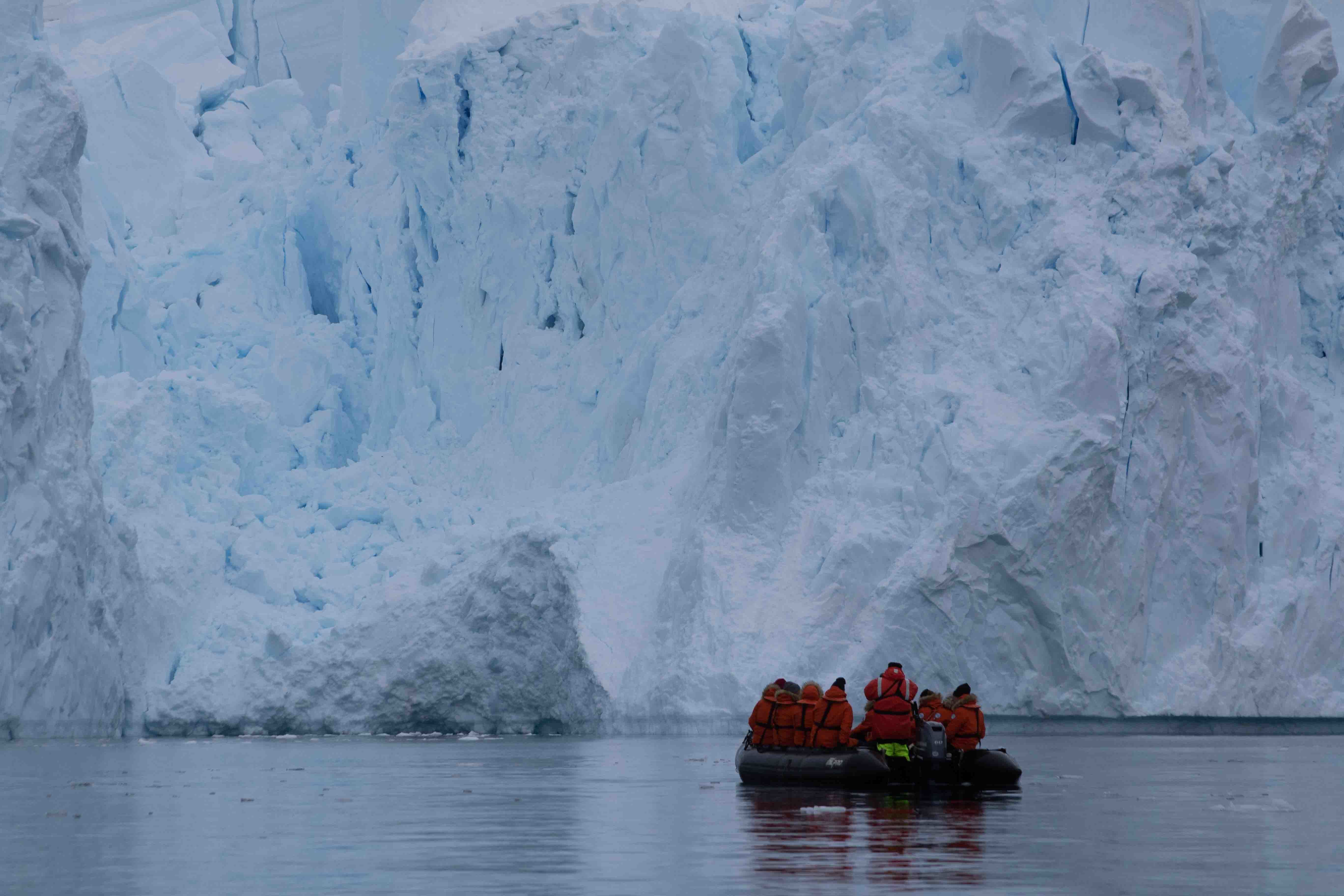 While this first group of folks were on land, the remaining group went around the bay on Zodiacs. Glacier faces and cloud-shrouded peaks set the backdrop of this black-and-white landscape. A few smallish icebergs floated in the bay. A leopard seal occupied one as a comfortable sleeping platform and it was likely soundly dreaming of krill and penguin meals. Along the edge of another iceberg, a crabeater seal swam around looking for a spot to launch itself out of the water to its resting site.