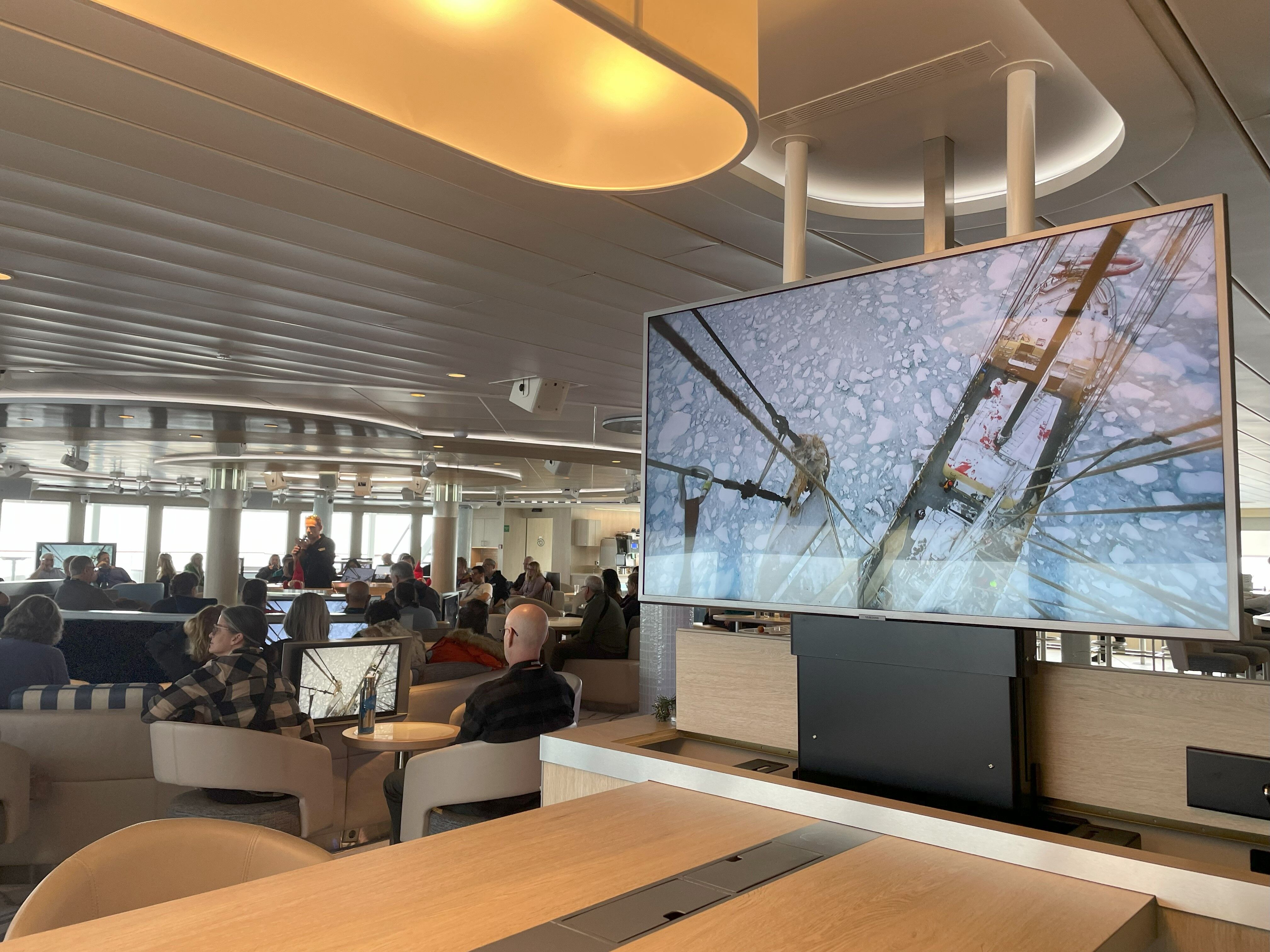 In the afternoon, our Captain and Bridge Crew navigated National Geographic Explorer through “Iceberg Alley.” Under moody gray skies, many of the icebergs displayed vivid blue colors, as though emanating an inner light. Then, the day got even better. As one guest recounted, laughing, “My favorite moment of the day was when Expedition Leader Jonathan announced the sighting of a humpback whale, and it sounded like he was reporting from a Backstreet Boys concert due to all of the screaming in the background.”