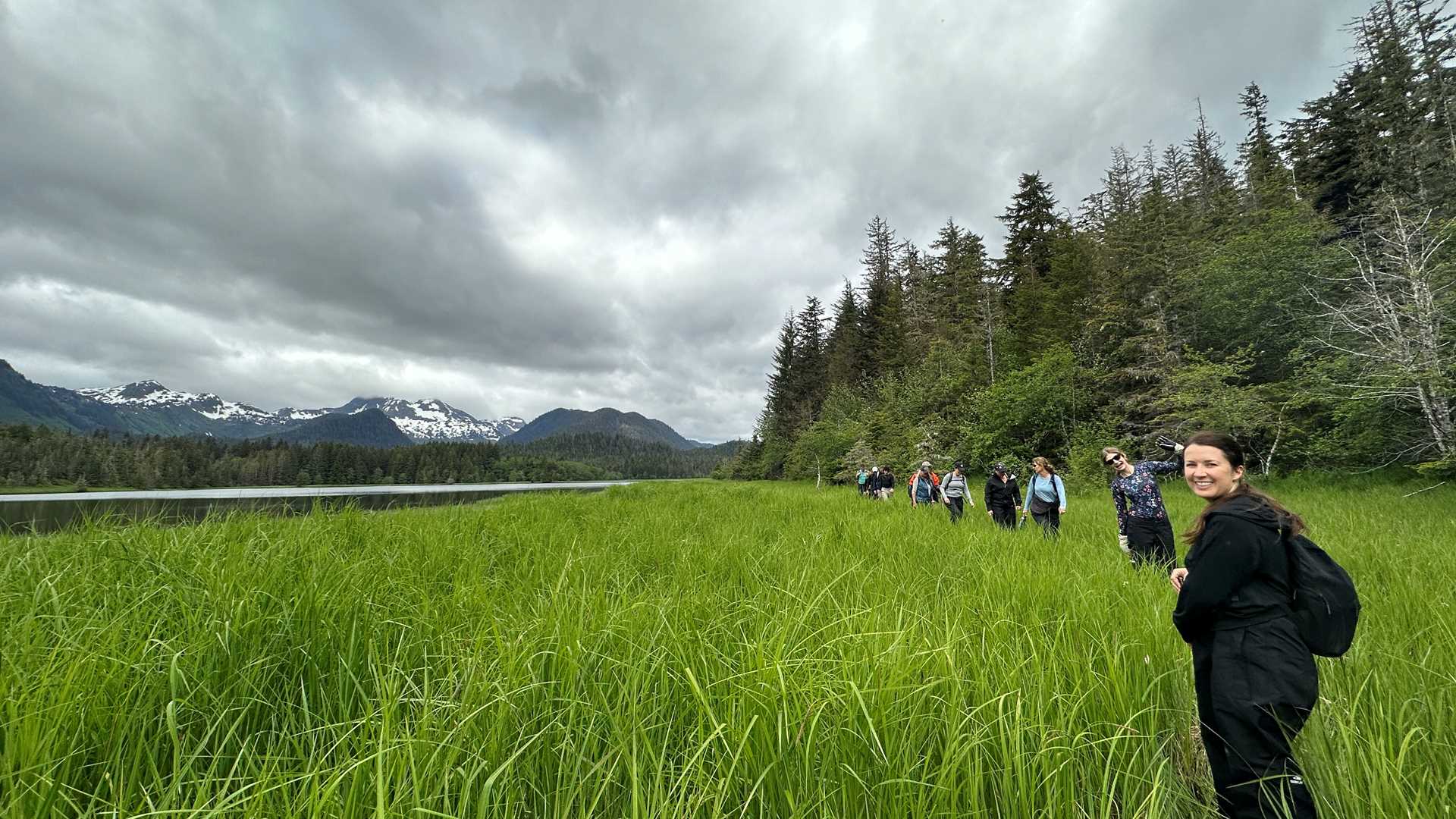 Tuesday started with hikes over game trails along the edge of a salmon stream heading towards Pavlof Lake. Hikers spotted beaver activity and bear scat while venturing around to take in scenic views of the stream, a beautiful lakeside meadow, and the mountainside. Hikers took between one to three hours to complete their journeys on differently paced and structured hikes. After the morning adventures, a brown bear mother and cub were spotted on shore wandering around the intertidal area. In the afternoon, guests had the option to enjoy Zodiac cruises along Freshwater Bay, most notably Cedar Cove, as well as kayaking. Those in Zodiacs spotted harbor seals, bald eagles, and pigeon guillemots in addition to other wildlife, while those in kayaks spotted jellyfish and sea stars under the sea. The day ended with a wonderful cocktail hour with charcuterie, wine, and presentations by the naturalists and undersea team.