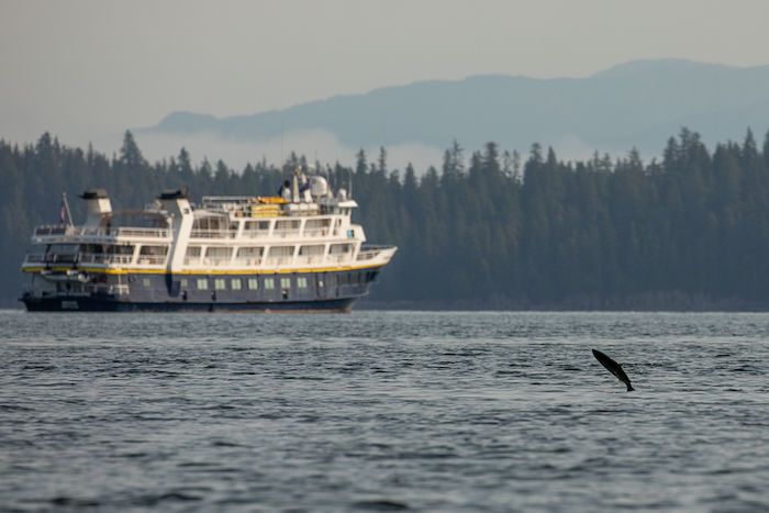 After a beautiful morning, National Geographic Sea Bird entered Chatham Strait. Sailing north, guests and staff took advantage of the warm—and sunny—weather to spot wildlife from the bow. At sunset, we spotted a group of humpback whales practicing cooperative bubble-net feeding, one of nature’s most spectacular wildlife behaviors. Up to 10 individual whales were diving and surfacing together in their search for food. We were lucky to spend time watching and photographing these animals as the golden light faded to a pink sunset over the mountains.