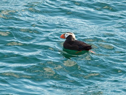 We were greeted early this morning with a stunning sunrise at 4 a.m. as we made our way south down Chatham Strait. The mid-summer early morning light played across the mountains of Chichagof Island as we pulled into Pavlof Harbor for our morning activities of kayaking and hiking. The tide was extremely low and the inner tidal walk was popular among the guests as they perused the shore looking for invertebrates such as sea star and limpets. Other guests enjoyed the solitude of the bay on kayaks with salmon jumping around them as they ready themselves for the upstream surge in a few weeks to being their spawning process. At low tide we were able to kayak up the small stream leading to the waterfall until the current turned us back to the saltwater. Meanwhile the other guests divided up into a long walk around Pavlof Pond to see a beaver lodge and others joined the shorter photo and natural history walks.